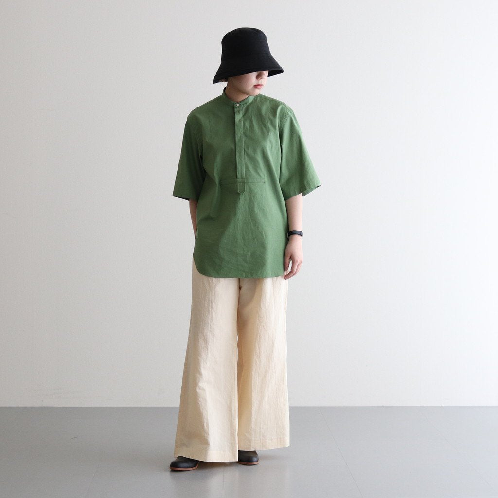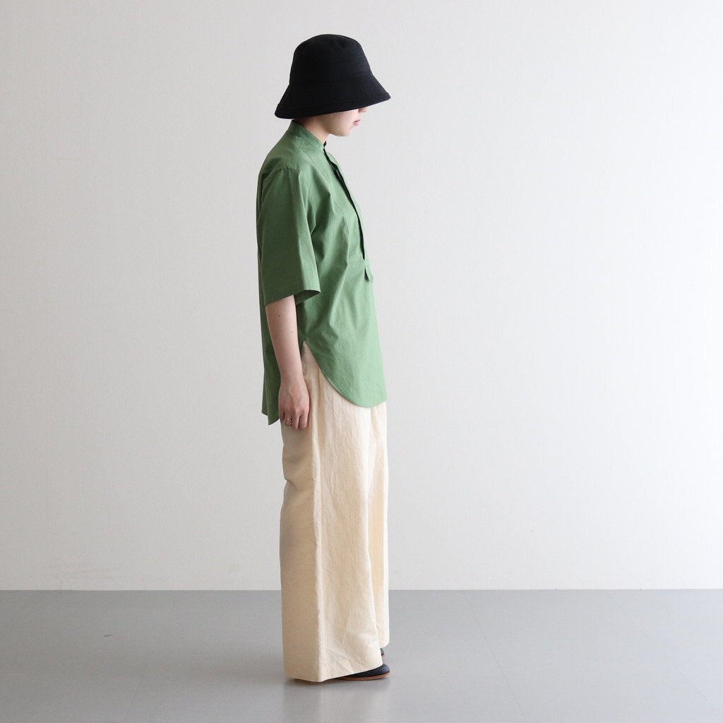 リネンならではの光沢感を活かしたツイル織りの生地を使用。凹凸感が強く出たリネン特有の風合いと清涼感のある肌触りが特徴的。