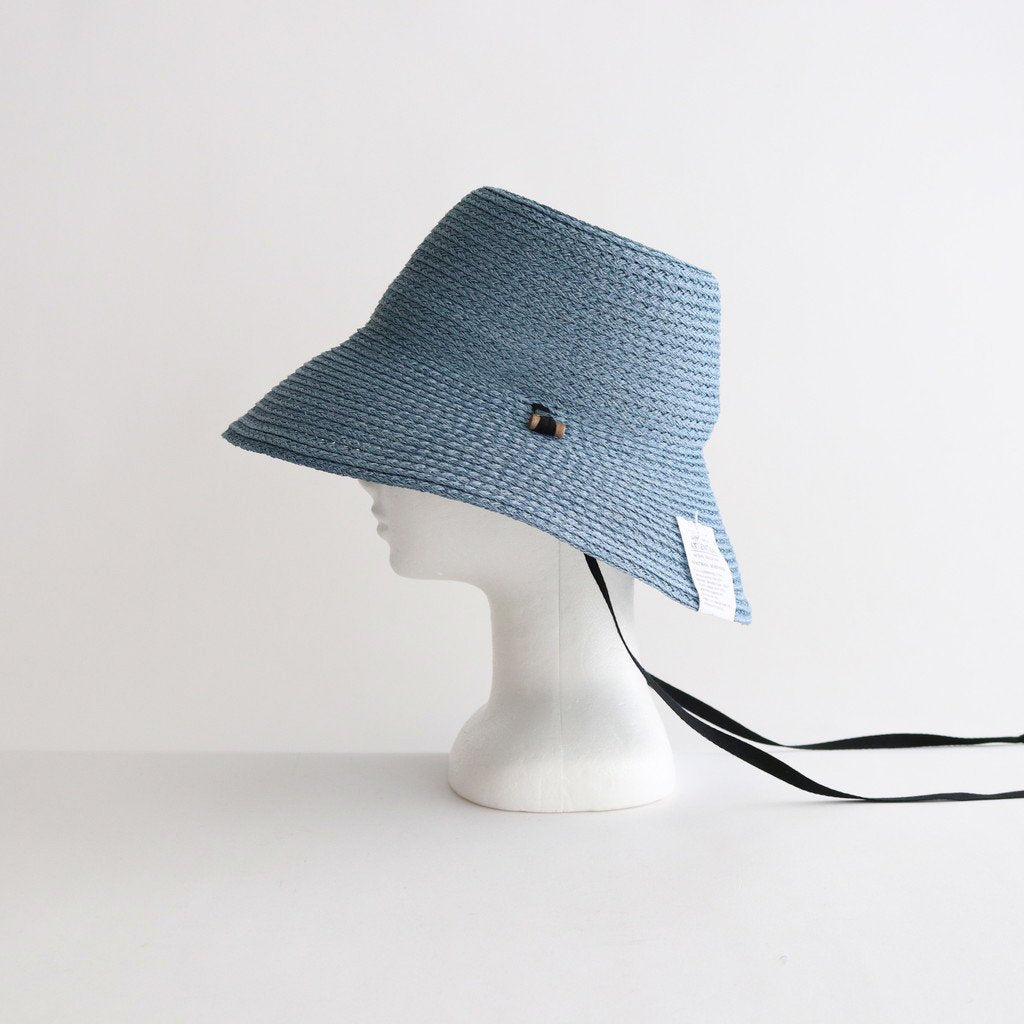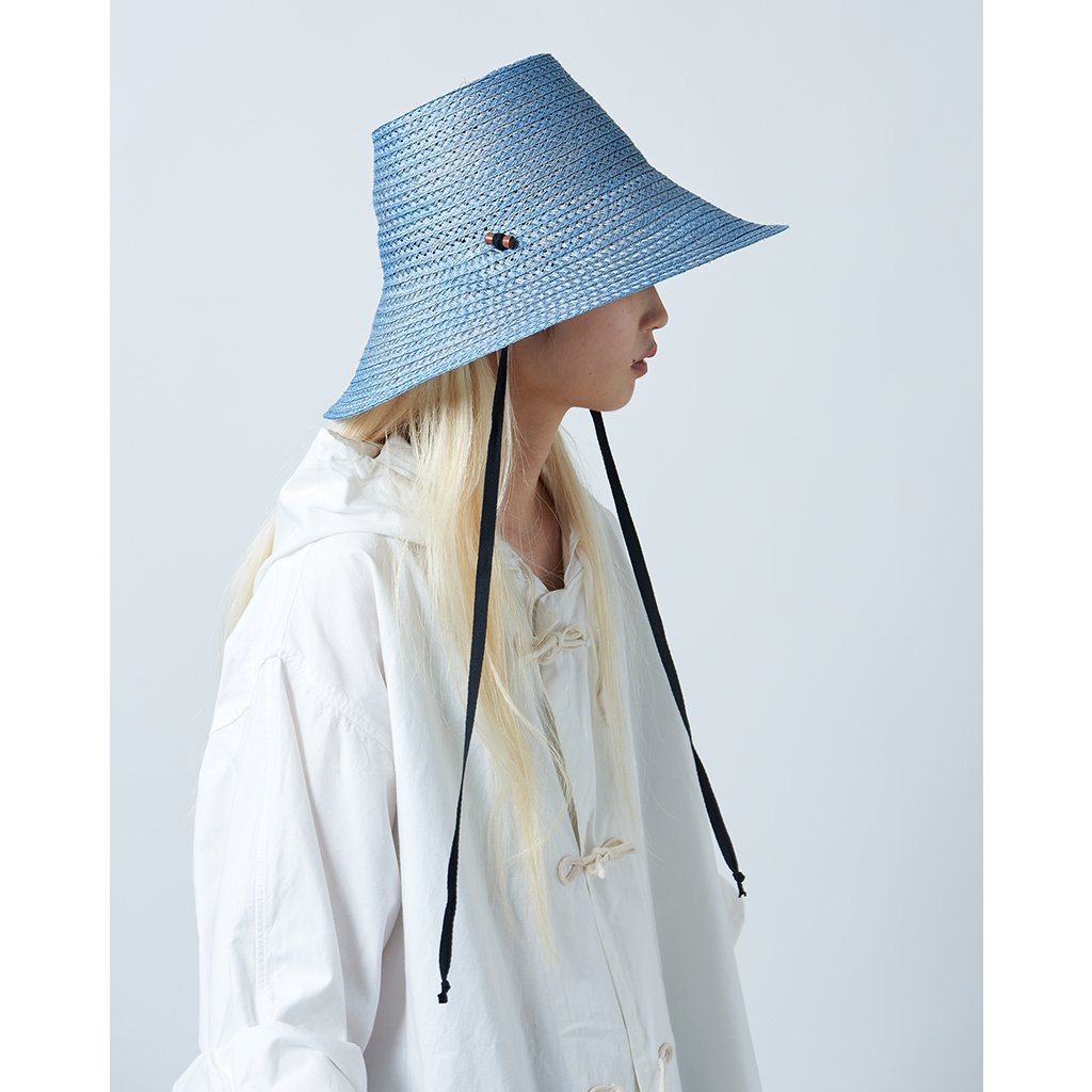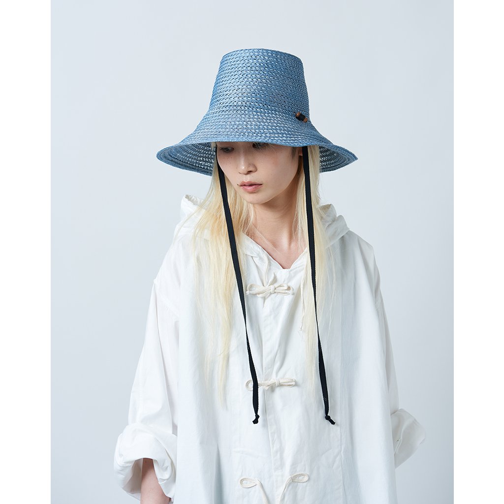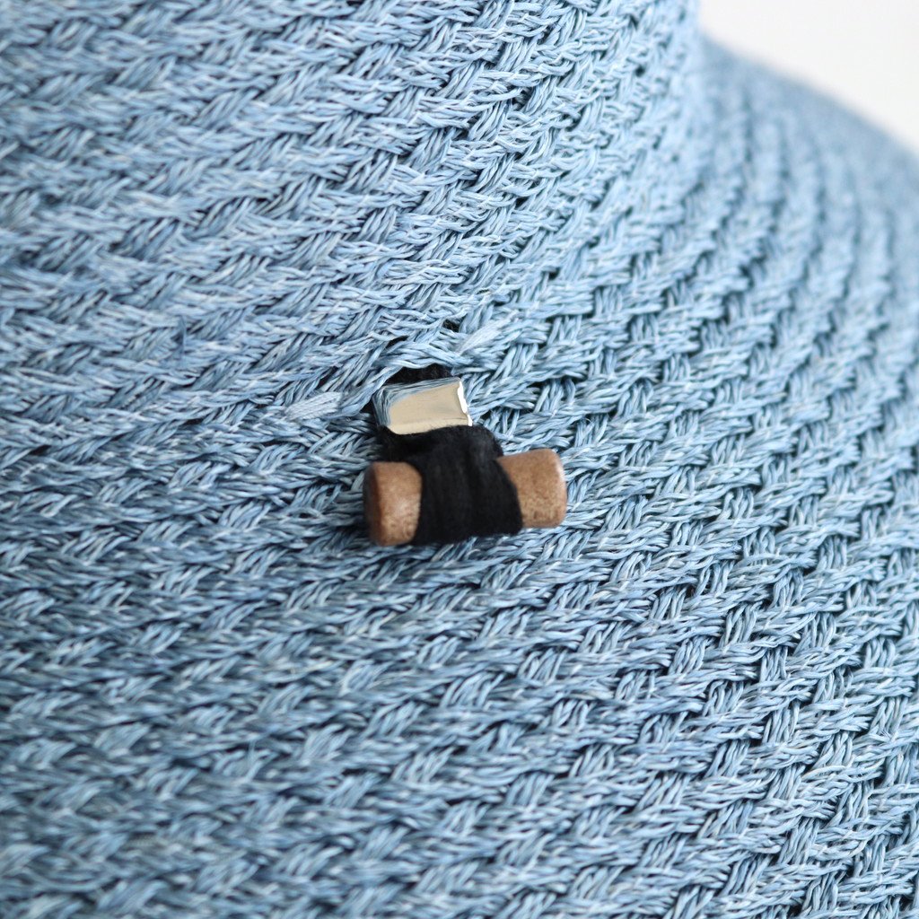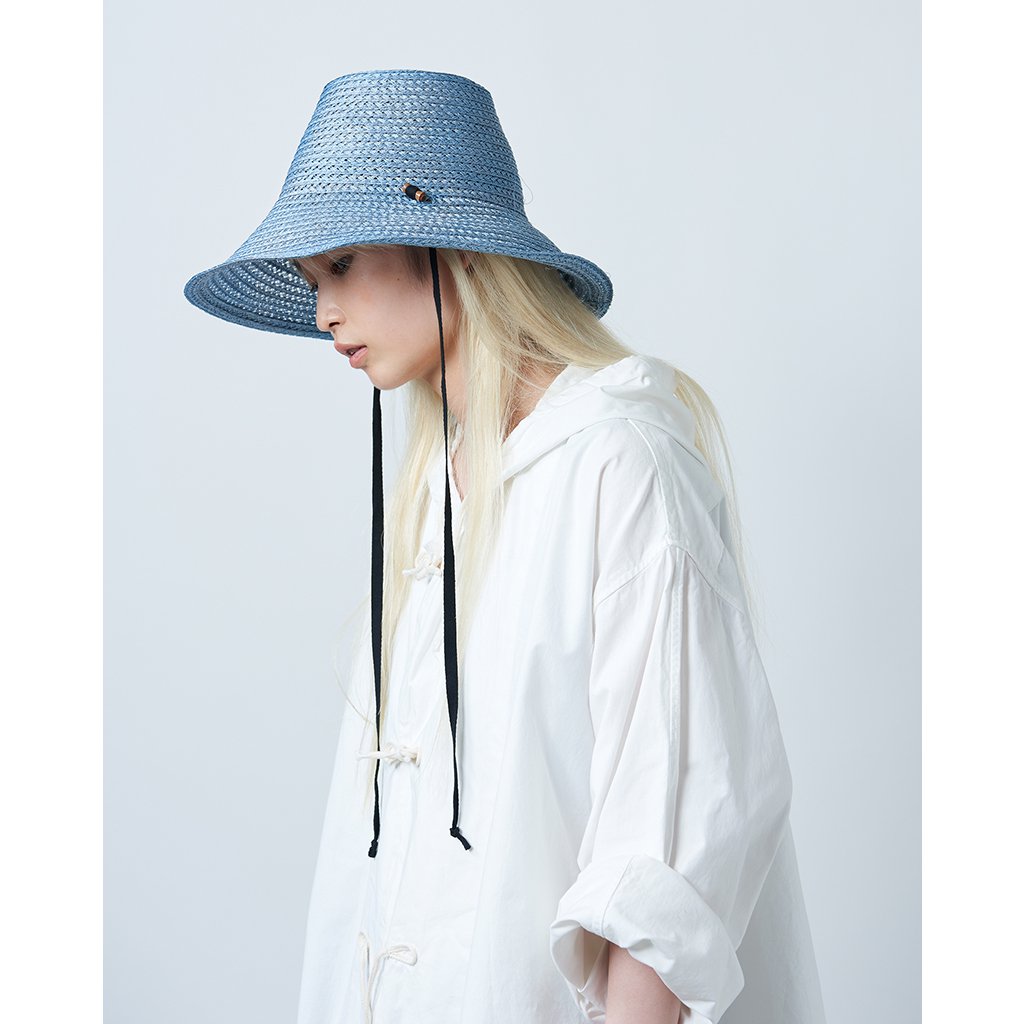 太陽の下でも安心なブリムの長さと、木漏れ日のような影を顔に落とす透け感が雰囲気の良いアイテムです。本来カジュアルな印象の強いストローハットですが、網目を繊細にし全体をハンサムなシルエットに仕上げることでよりクリーンな印象を強めた仕上がり。ブリム端にはワイヤーを入れ折り上げたり伸ばしたりとアレンジが可能。左右には取り外し可能なコットンコードを配し、ウッドパーツをアクセントにしています。