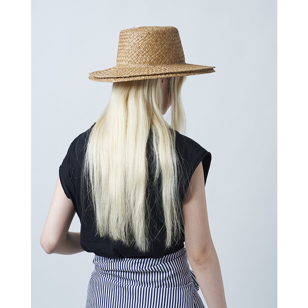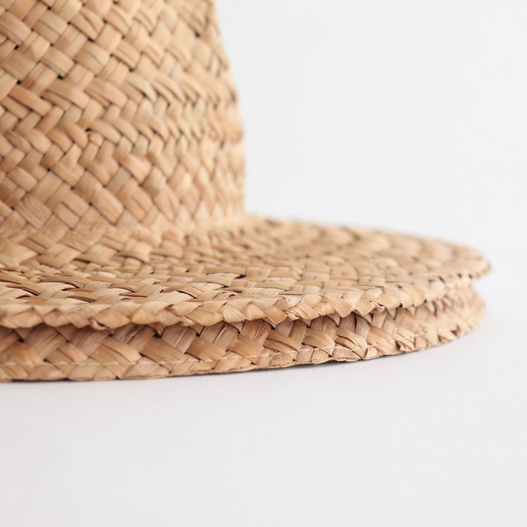 砂漠を探検する女性用の帽子をイメージしてデザインされたモードな表情のストローハット。角の効いたマニッシュなフォルムで製作されており、長めのブリムは顔周りを土星のように囲います。帽子自体の印象が強いためラフなヘアスタイルにも合わせることのできる一品。夏場のラフなスタイルに合わせるだけでスタイル全体が締まる存在感のあるモデルです。