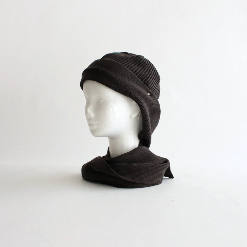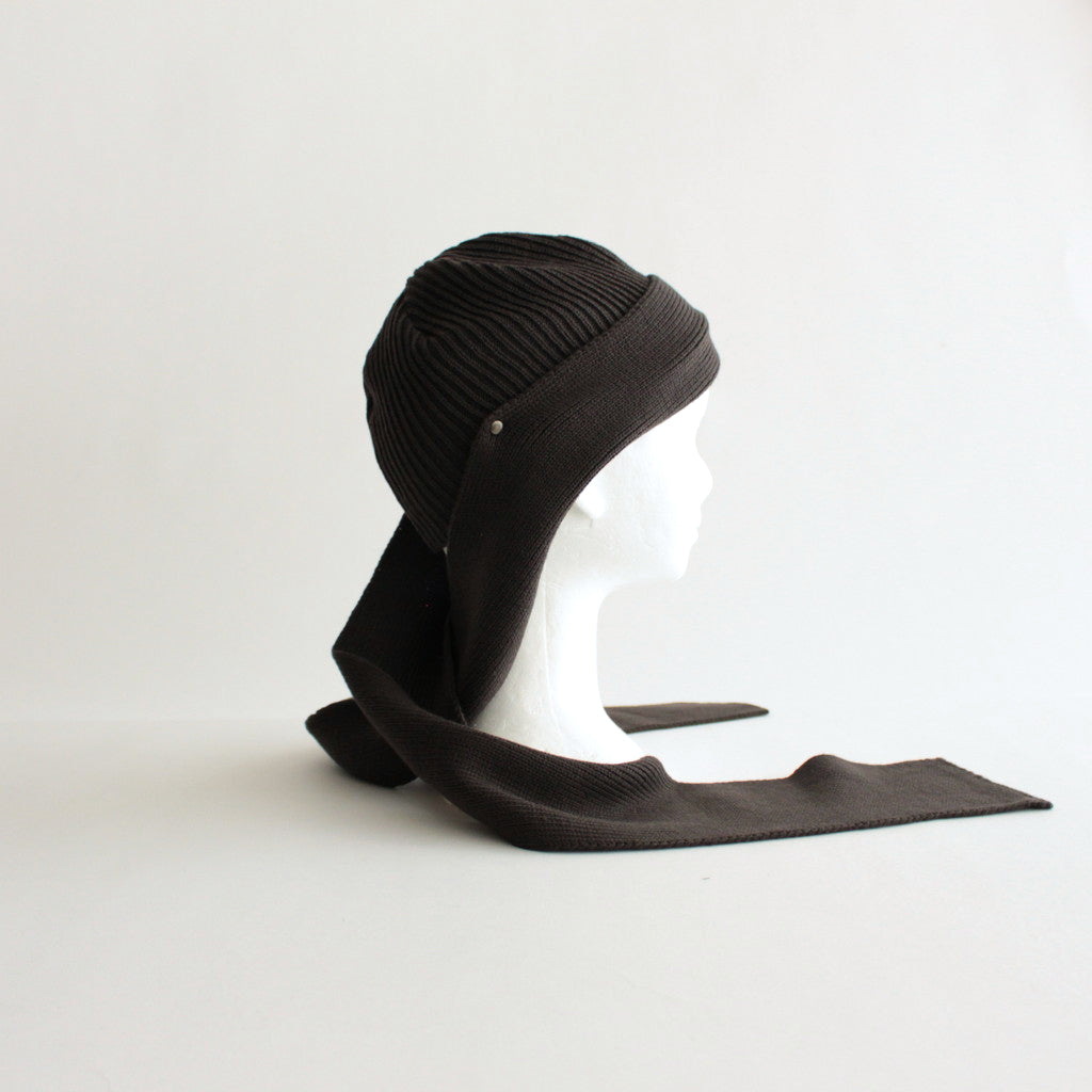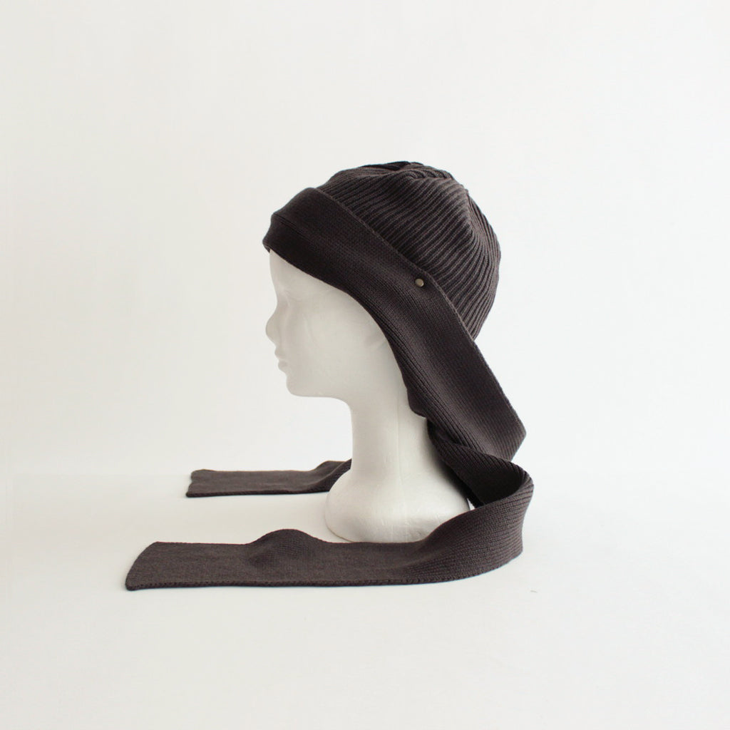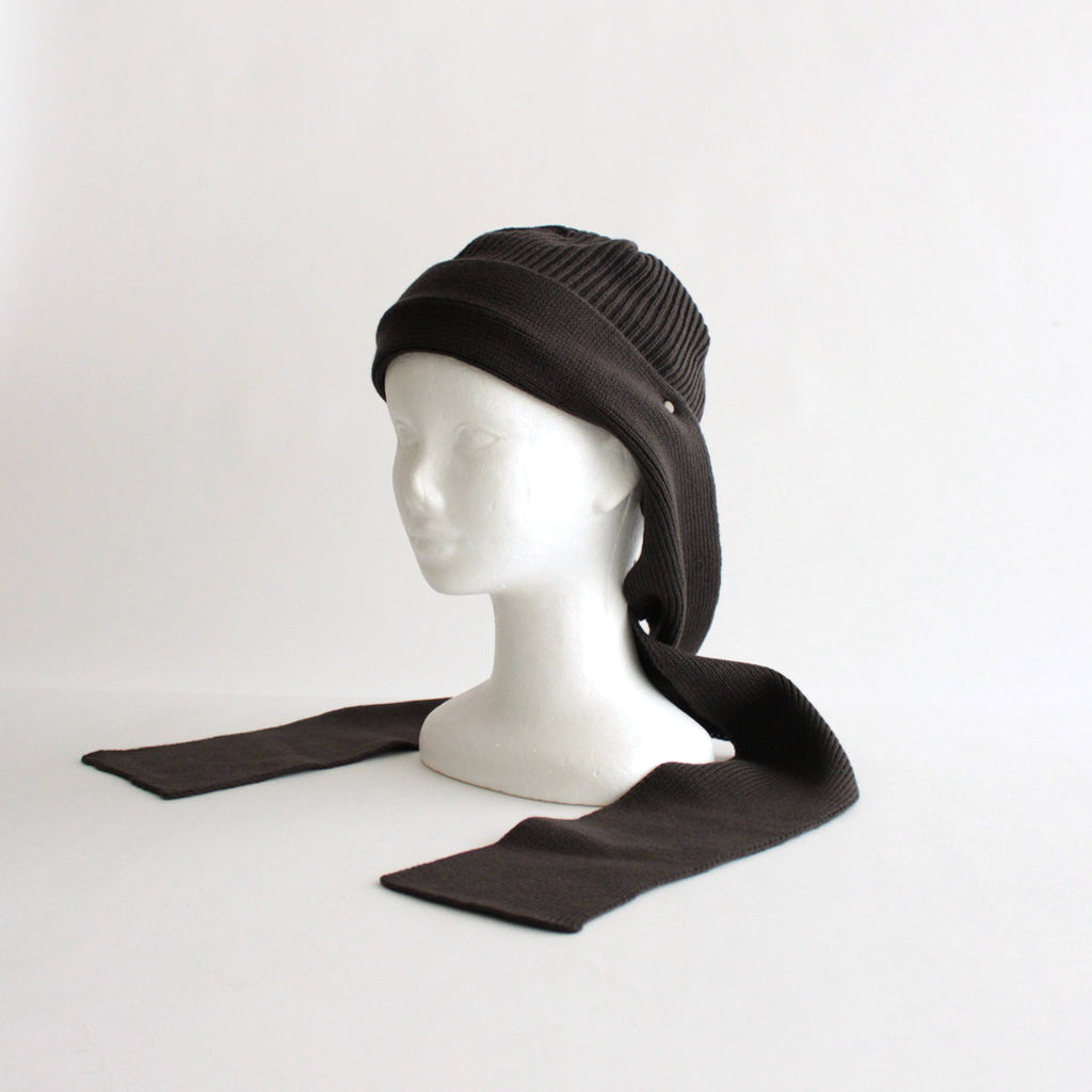 ショートワッチにニットスカーフをドッキングしたようなデザインのニット。デザインソースはvintageのボンネットという帽子の形から。両サイドの耳裏から長く垂れるニットスカーフがポイントです。スカーフはメタルパーツで本体に止めつけてあり、スカーフを垂らしたままでも、後ろで結んだりアレンジしても楽しめる仕様に。寒い日は首に巻き付けてバラクラバのような使い方も可能です。