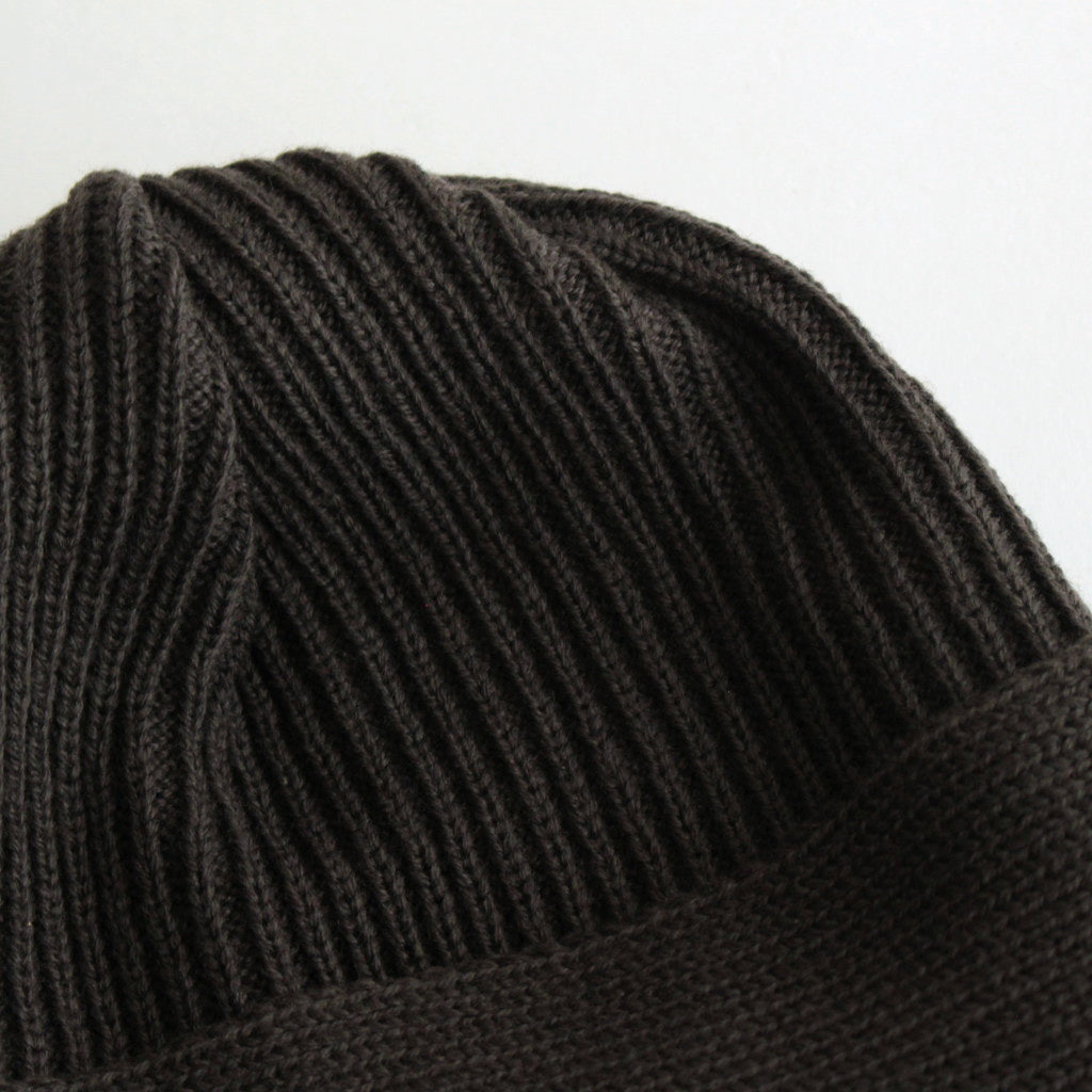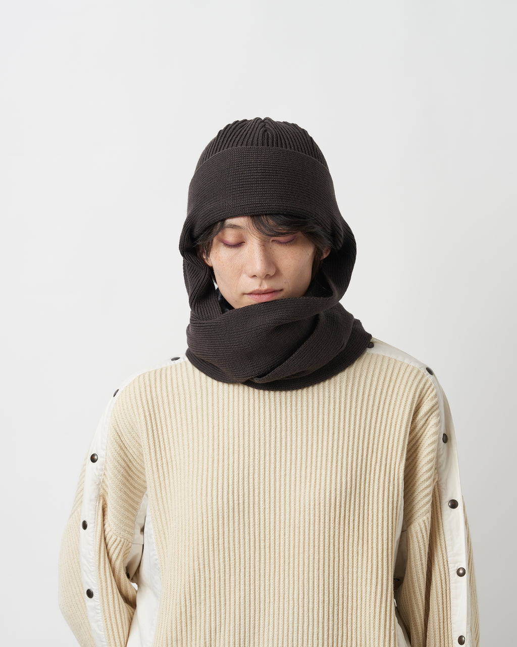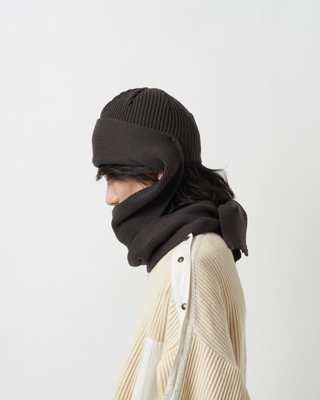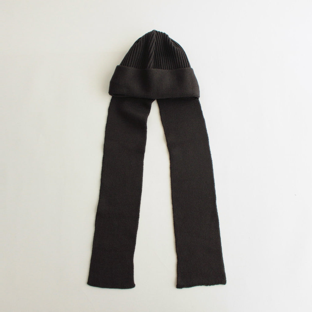 ショートワッチにニットスカーフをドッキングしたようなデザインのニット。デザインソースはvintageのボンネットという帽子の形から。両サイドの耳裏から長く垂れるニットスカーフがポイントです。スカーフはメタルパーツで本体に止めつけてあり、スカーフを垂らしたままでも、後ろで結んだりアレンジしても楽しめる仕様に。寒い日は首に巻き付けてバラクラバのような使い方も可能です。