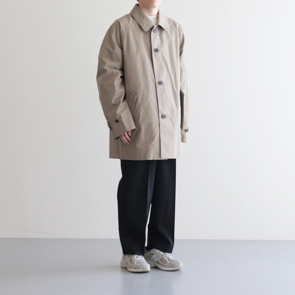 steinのバルマカンハーフコート。生地は70/2の追撚した超長綿糸を高密度に織り上げたバーバリークロス。通常の織機では打ち込めない密度で打ち込み製作することで、超長綿特有のしなやかさ、繊細なタッチを残したまま、シルエットが綺麗に出るよう適度なハリ感を併せ持つ生地となっています。フロントは4B仕様、袖先に二段階でアームホールの幅の調節が可能なボタンが付属。各部位の釦には高級な水牛ボタンを採用。袖裏にはキュプラの裏地が付いているため、スムーズに袖を通していただけます。アクセスのしやすい位置にフラップポケット、肩のラインが綺麗に出るラグランスリーブ、後身頃に入った深めのインバーテッドプリーツが特徴的。大振りなバルカラーコートをハーフ丈に設定し、各バランスを調整して作られており、シルエットは身幅、アームホールをたっぷりと取ったsteinと言えばなゆったり目のシルエットです。一見ロングコートのようなビジュアルながらも使いやすいハーフ丈のコートなっているので、是非スタイリングの主役にしてください。質の良さとデザイン、シルエットの良さで長く愛用していただけるsteinならではのプロダクトです。
