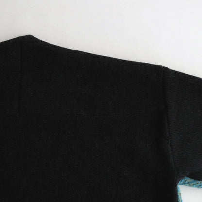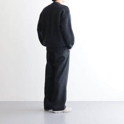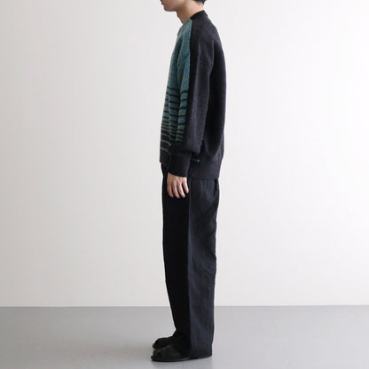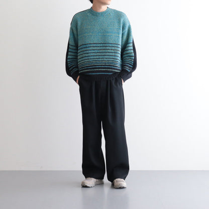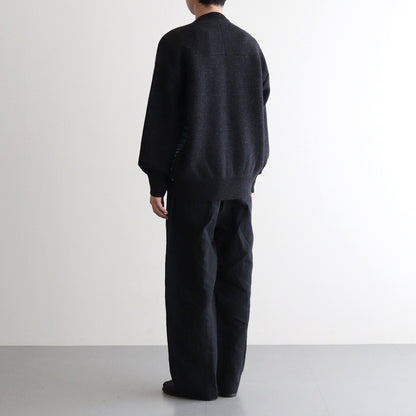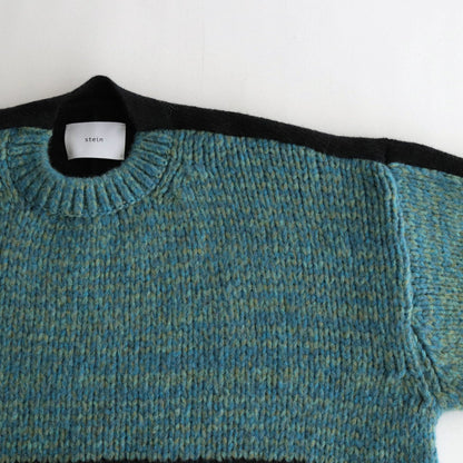 ゆったりとしたシルエットで製作されクルーネックセーターです。前後で素材と編み方を変えることでコントラストのある仕上がりに。ネックや袖先、裾をリブ編みに切り替えることで強度を高めるとともに、収まりの良いシルエットに仕上げています。