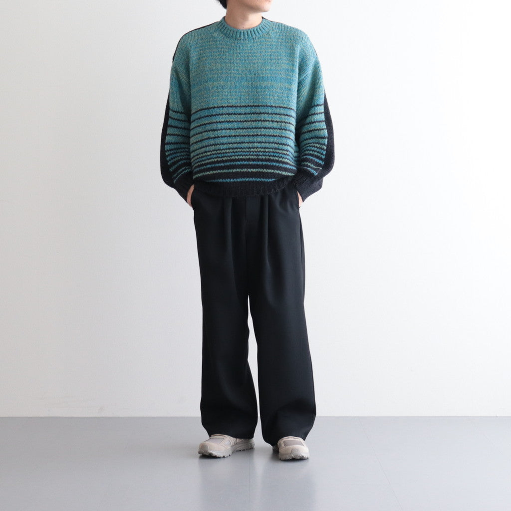 繊細かつ滑らかなベビーアルパカ素材を使用。ループ状の糸を作って3本ミックスした後、さらに摩耗加工を施すことで膨らみのある毛足を表現。ここに風合いの違うシルクモヘアの糸をミックスすることでボーダー柄を表現し、風合いにも色合いにもコントラストを付けています。
