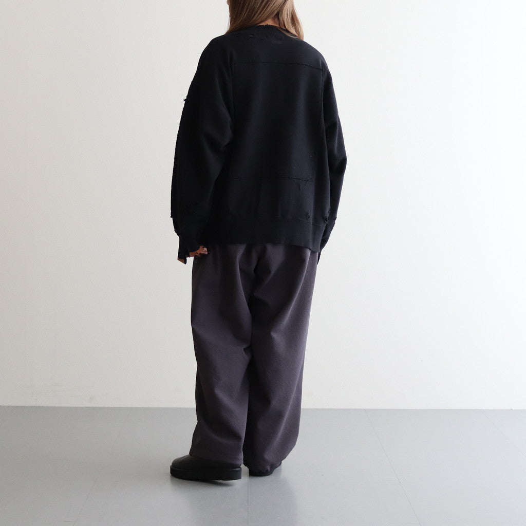 肌触りが柔らかくしなやかなコットン素材を使用した裏毛生地を使用。裏糸に太番手の糸を使用し、適度な肉感とふっくらとした柔らかいタッチが特徴です。加工により経年で着古してできたダメージ感を追求しており、コシの抜けた柔らかい生地感も魅力。