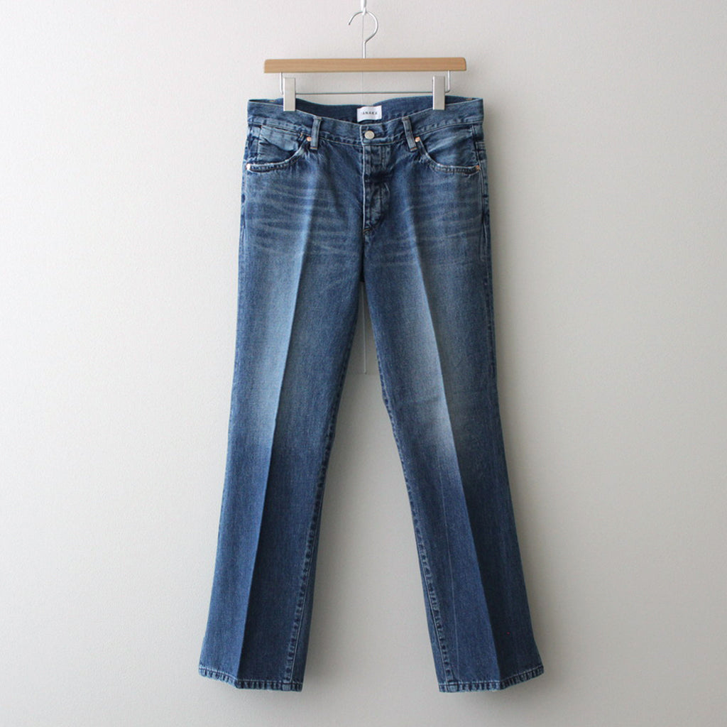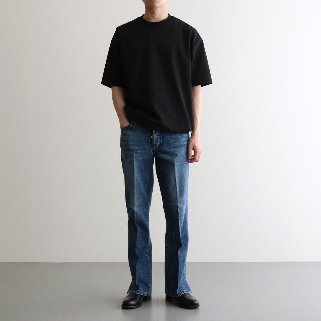 股上を浅めにし、全体をコンパクトな作りにしながら裾をフレアさせてブランド独自のフレアシルエットのデニムです。クラシックなコインポケット付きの5ポケット仕様で製作しており、裾までしっかり通るセンタープレスも印象的。流れるような自然なフレアシルエットと、力の入りすぎないラフな雰囲気が魅力の一本。