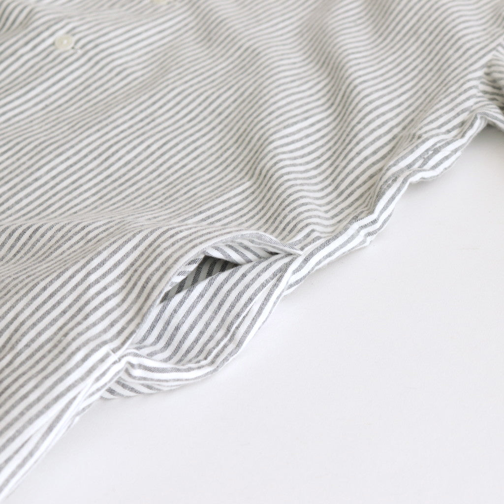 上質なコットンを使用したフランネル生地を使用。柔らかくしなやかなコットンの糸を綾織で織り上げ、表面を起毛させることによって豊かな表情とほどよい肉感を持たせています。裏面はフラットな質感のままにすることで肌に当たる部分の心地よさを追求した作りに。天然繊維ならではの表情と肌当たりの良さをお楽しみいただけます。