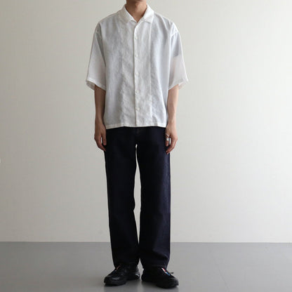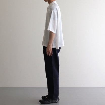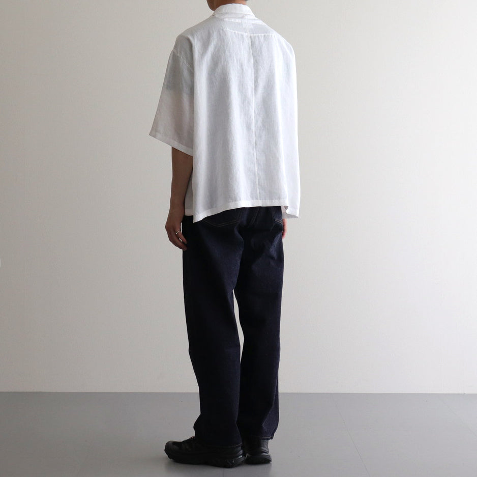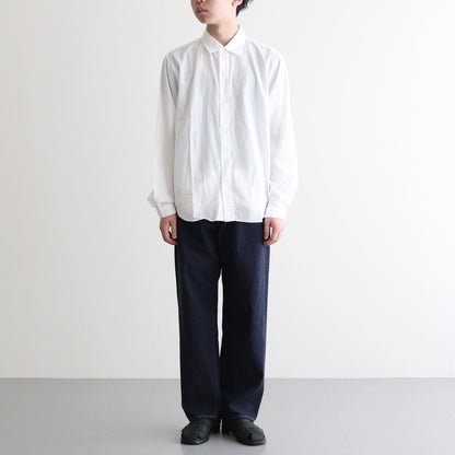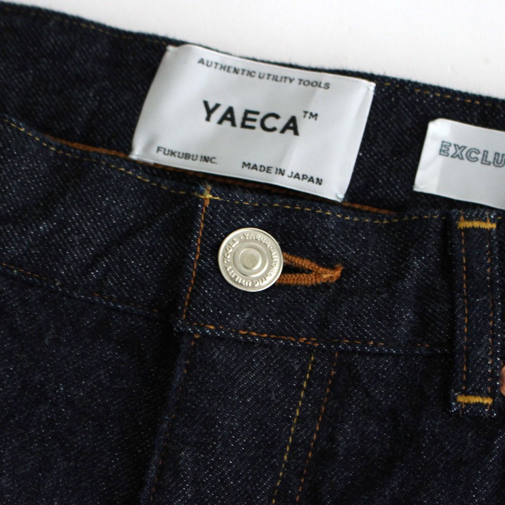 こちらはワイドストレートシルエットのモデル。ヒップと太腿部分にゆとりを持たせ、裾にかけてほんのりとわずかにテーパードをさせてリラックスしたストレートなラインにした、自然で綺麗なシルエットです。腰周りの優しいボリューム感と微弱にかかったテーパードのバランスがとても良く、どんなコーディネートにもスッと馴染んでくれるシルエットです。フロントはジッパーフライ、バックポケットにYAECAのピスネーム付き。タックボタンやリベットには「YAECA」のネームが入ります。