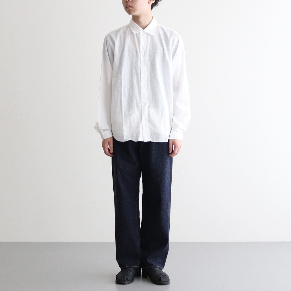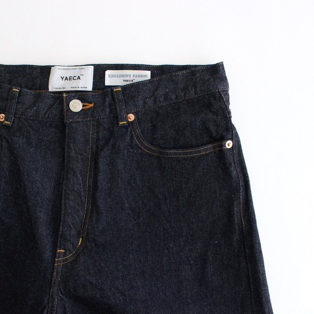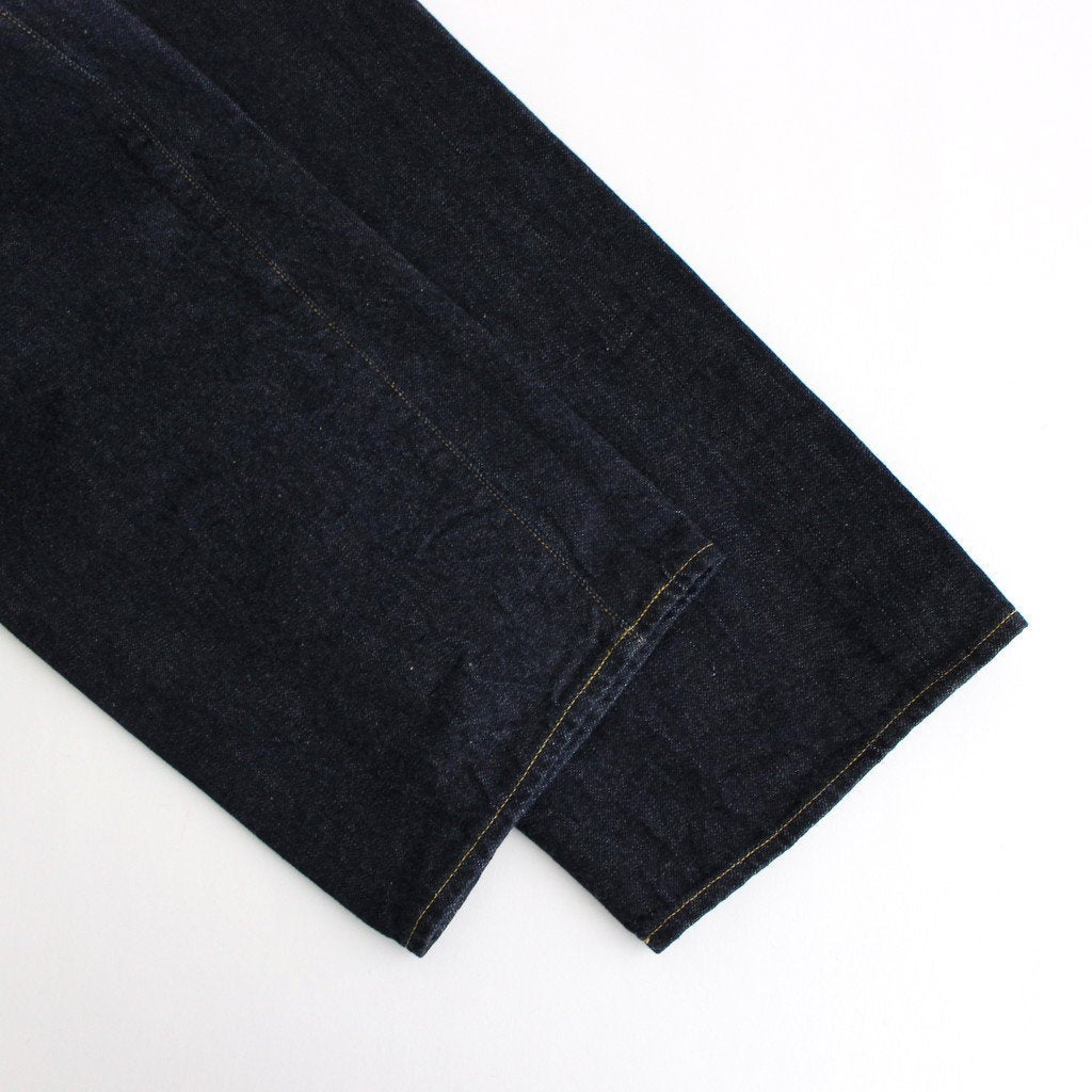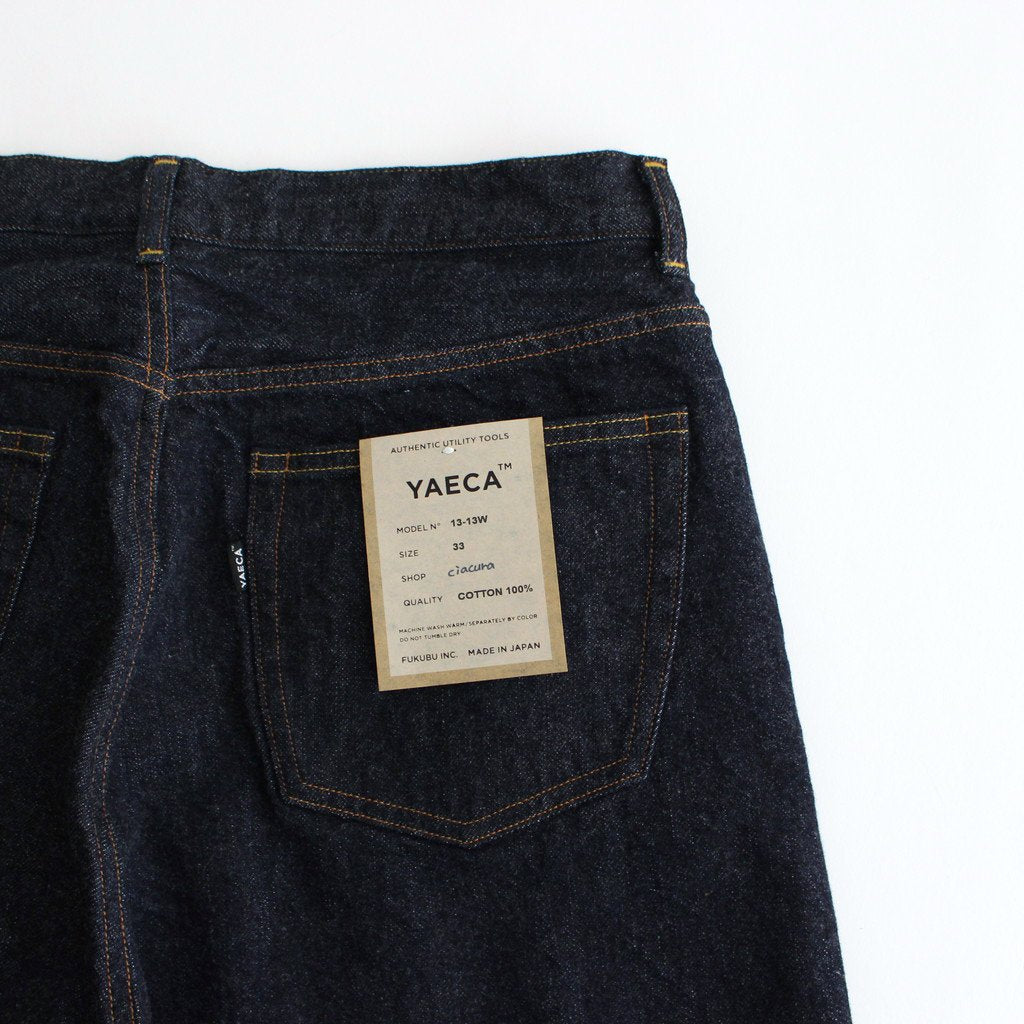 YAECAの定番モデルとして長く愛されているデニムパンツ。オーセンティックな5ポケットデザインの普遍的な佇まい。糸の選定から生地を織り上げるまでの全工程に拘り、YAECAがオリジナルで製作した13ozセルビッジデニムを使用。製品後にワンウォッシュを掛けることで余分なインディゴ染料を落としてインディゴの色合いを安定させ、天日乾燥仕上げにすることで自然なシワ感を演出し、生地を馴染ませています。深く、奥行きのある色合いが魅力的なYAECAオリジナルのインディゴデニムは長く穿き続けることで生まれる色落ちやシワなど、成長させて頂く過程でこのジーンズの良さをより実感して頂けると思います。レギュラーオンスのしっかりとした生地の厚みと風合い、一生涯付き合っていけるジーンズとして長くご愛用して頂ければと思います。