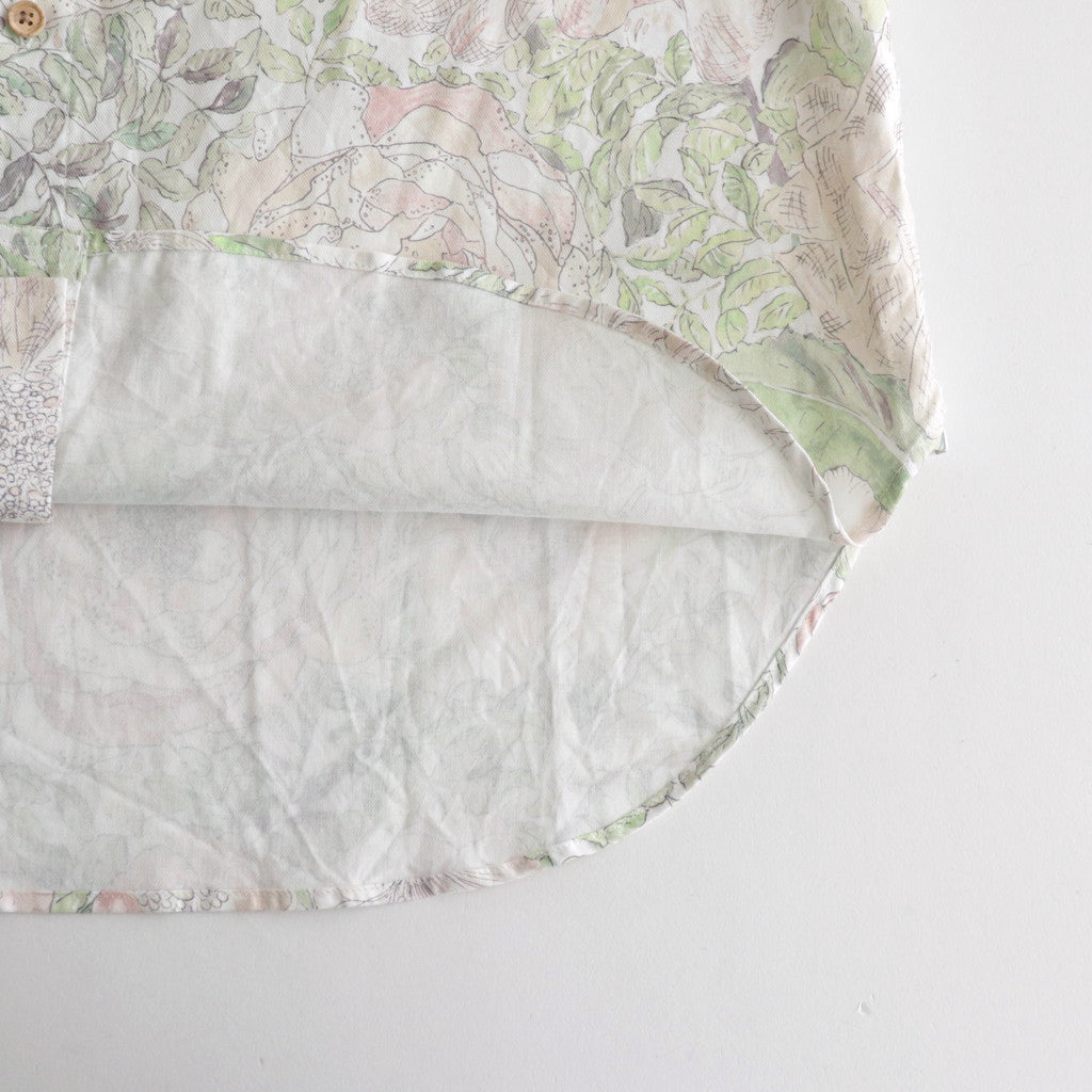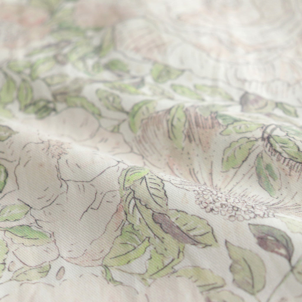 英国のLIBERTY LONDON社が独自に開発したタナローン素材を使用。シルクのような艶感と手触りを木綿で再現した上質な生地。柔らかく軽やかな肌触りと豊かなドレープ性が特徴です。また淡い色調でローズが描かれたこの柄には「Rose xanthe(ローズザンジー)」という名前が付けられており、総柄にもかかわらず、さりげない色味のため着まわしやすいデザインです。
