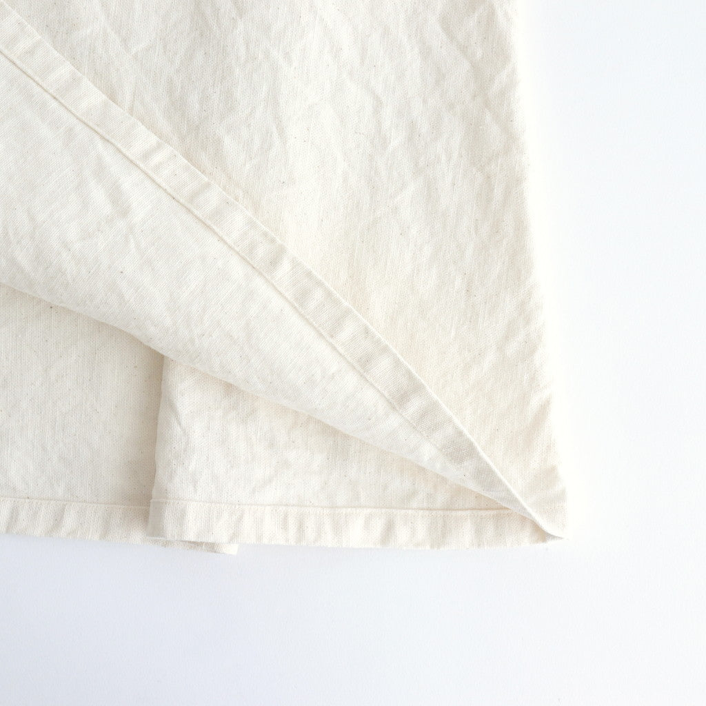 コットンとリネンを半分ずつの割合でミックスした天然素材の風合いが存分に楽しめるキャンバス生地を使用。太さのある糸を使用していますが糸を甘撚りにして空気を含ませながら織り上げることで、リネンのカリッとした風合いが残りながらもふっくらとした柔らかさを感じることのできる生地に。ワークウェアらしい見た目ながら柔らかく快適な着心地に仕上がっています。