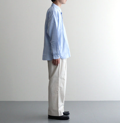 洗いざらしの自然なシワ感が全体に優しい印象を与えるコットン素材を使用。ハリコシがりリラックス感と上品な清潔感を持ち合わせた印象。サラッとした肌触りが心地よく素肌にも着用可能。オールシーズン着ていただける中肉厚の生地感です。