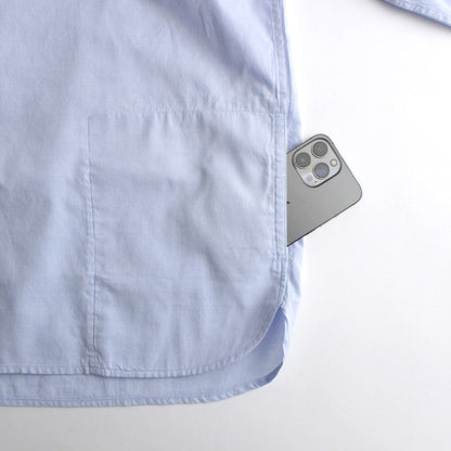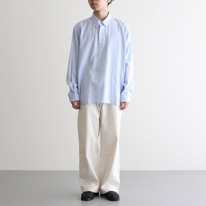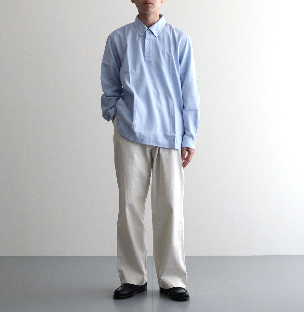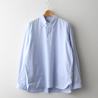 ブランドのアイコンであるコンフォートシャツのプルオーバータイプ。身幅や肩幅はレギュラーで裾がラウンドしたスタンダードシルエットです。襟はボタンダウン。オーソドックスなレギュラーシャツの様なバランスなので様々な着こなしに取り入れて頂けます。素縫製を極力表側に見せないようにしたステッチレス仕立てにすることでミニマルな佇まいに。腰の位置にハンドポケット付き。