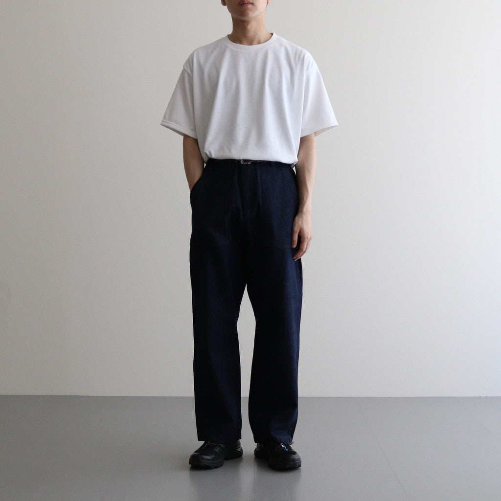 腰の位置にベイカーポケット、バックにパッチポケットを配置。ハイウエスト気味の腰回りからゆとりを持たせたヒップ周り、裾に掛けてほんのりとテーパードをかけた収まりの良いリラックスシルエットです。股下部分は180度の開脚が可能なガゼットクロッチ仕様です。フロントはWALDES社製ファスナーを採用したジップフライ。