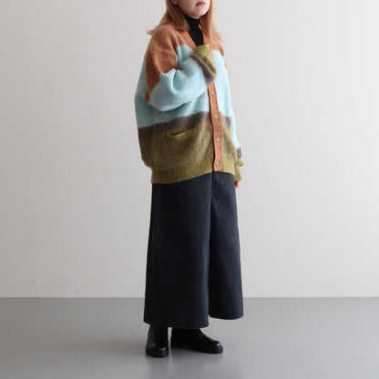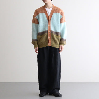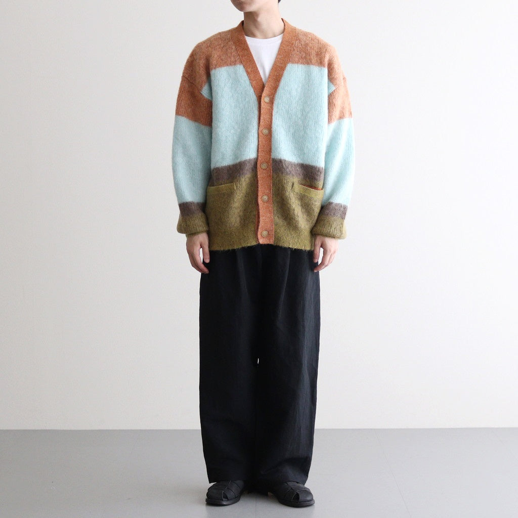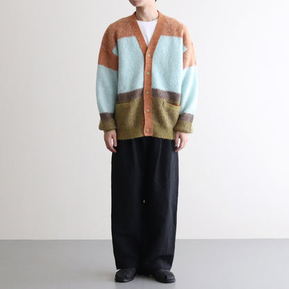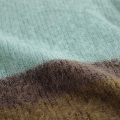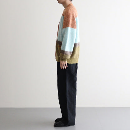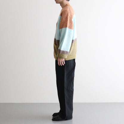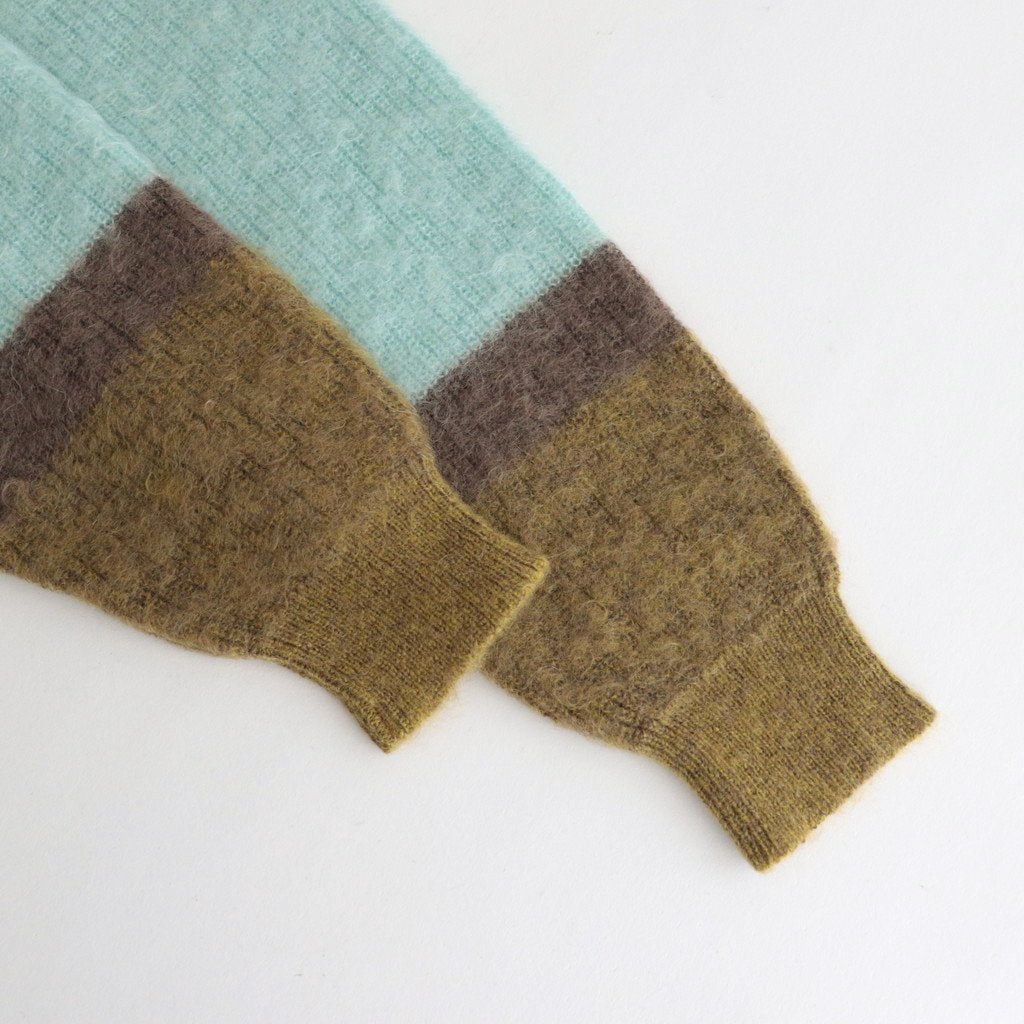 ベン・ニコルソン作品の配色を表現したニット。キッドモヘアを使用した、タムタムヤーンと呼ばれる毛足を持たせた素材を使用しています。アンゴラ山羊の毛であるモヘアは、ウール比べスケール(繊維の表面のうろこ部分)が小さく、滑らかでやわらかい質感と毛に上品な光沢があります。キッドモヘヤの糸を使用し、作品の雰囲気を表現するために起毛加工をし境目がはっきりしないようぼかし、その後古着のモヘヤの雰囲気にするため縮絨加工を施しておいます。(通常は、縮絨後に起毛加工をするのが一般的です。)製品全体に起毛加工を加えており毛足を出した後に更に縮絨加工も加えることでカールした毛足を表現し独特な雰囲気の有る表情のニットです。