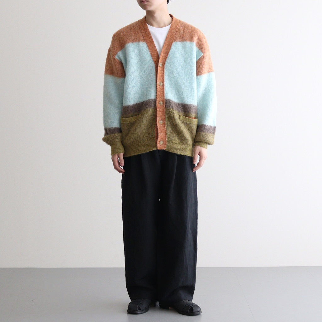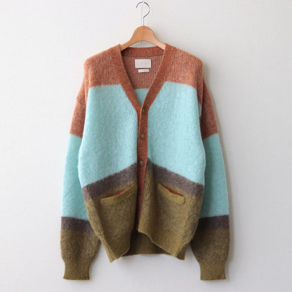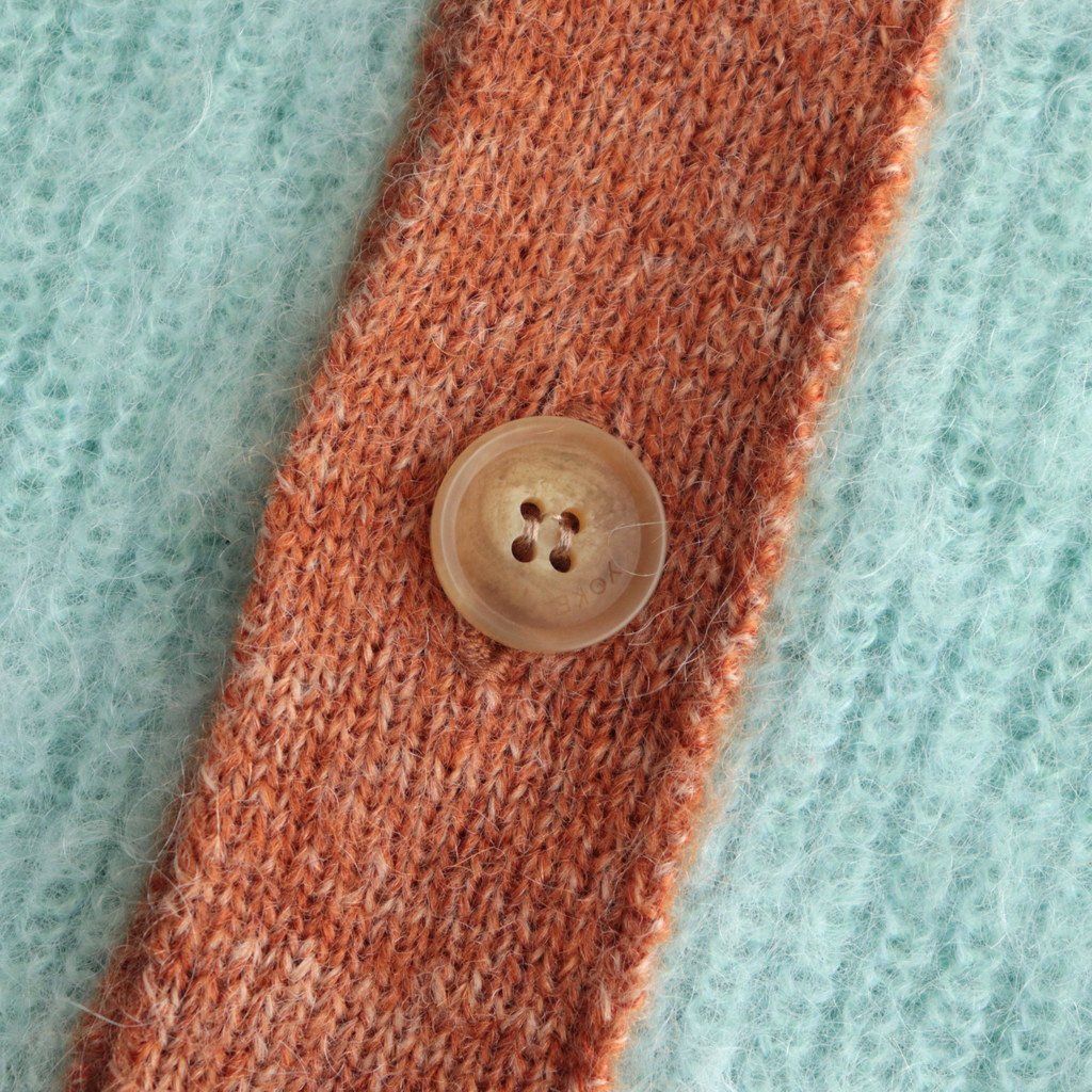 YOKEのモヘアカーディガン。フロントは高級感のあるボタンを使用した5ボタン仕様。前立ては別のニット地で切り替えることで、デザインのアクセントだけでなく耐久性を高めた作りに。繊細なファーと綺麗な色目で、アウターからすこしのぞかせても◎。質の良さとデザイン、シルエットの良さで長く愛用して頂けるYOKEならではのプロダクトです。
