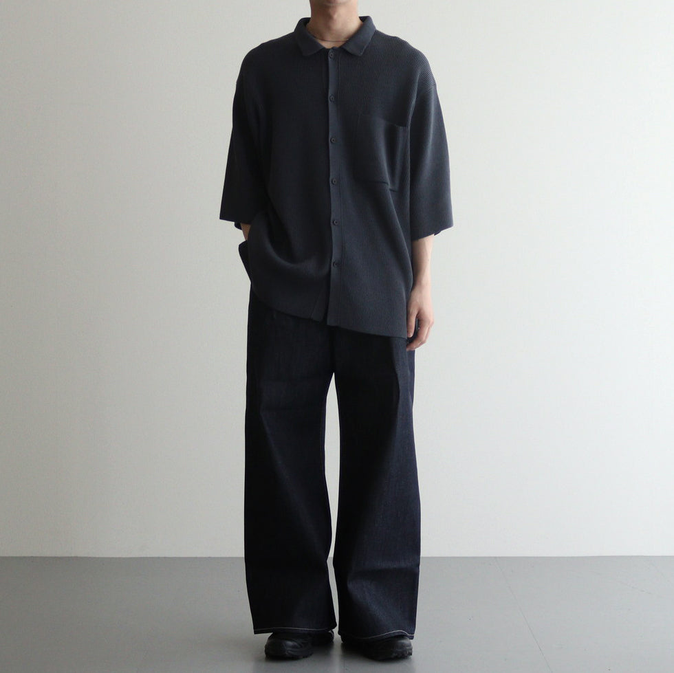 身幅をゆったりとったボックスシルエットのニットシャツ。襟はポロシャツのような形でリブ編みに切り替えられています。袖はセットインスリーブ、裾はボックスカット。袖先や裾は折り返したりリブに切り替えたりせず、プレーンな印象に仕上げています。左胸にパッチポケットがデザインされている以外特に装飾はなく、ニット素材であることを強調したようなシンプルな仕立てとなっています。