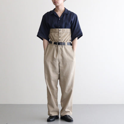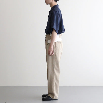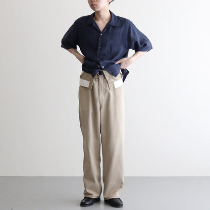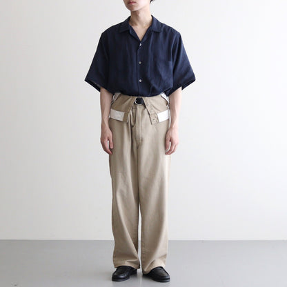 ユーズドのチノパンツを解体し、つなぎ合わせることで再整形したダブルウエストチノパンツ。ウエストを2重にしたデザインが特徴的。上部をコルセットのように高い位置で留めたり、折り返して腰穿きしたり、ベルトで留めたりと、様々な着こなしがお楽しみいただけます。