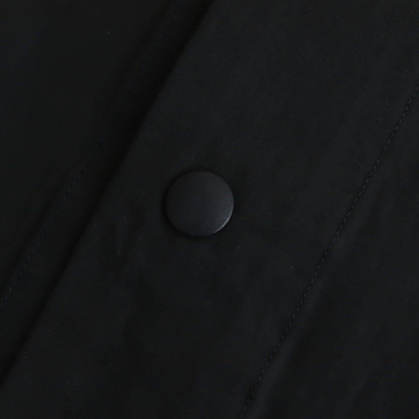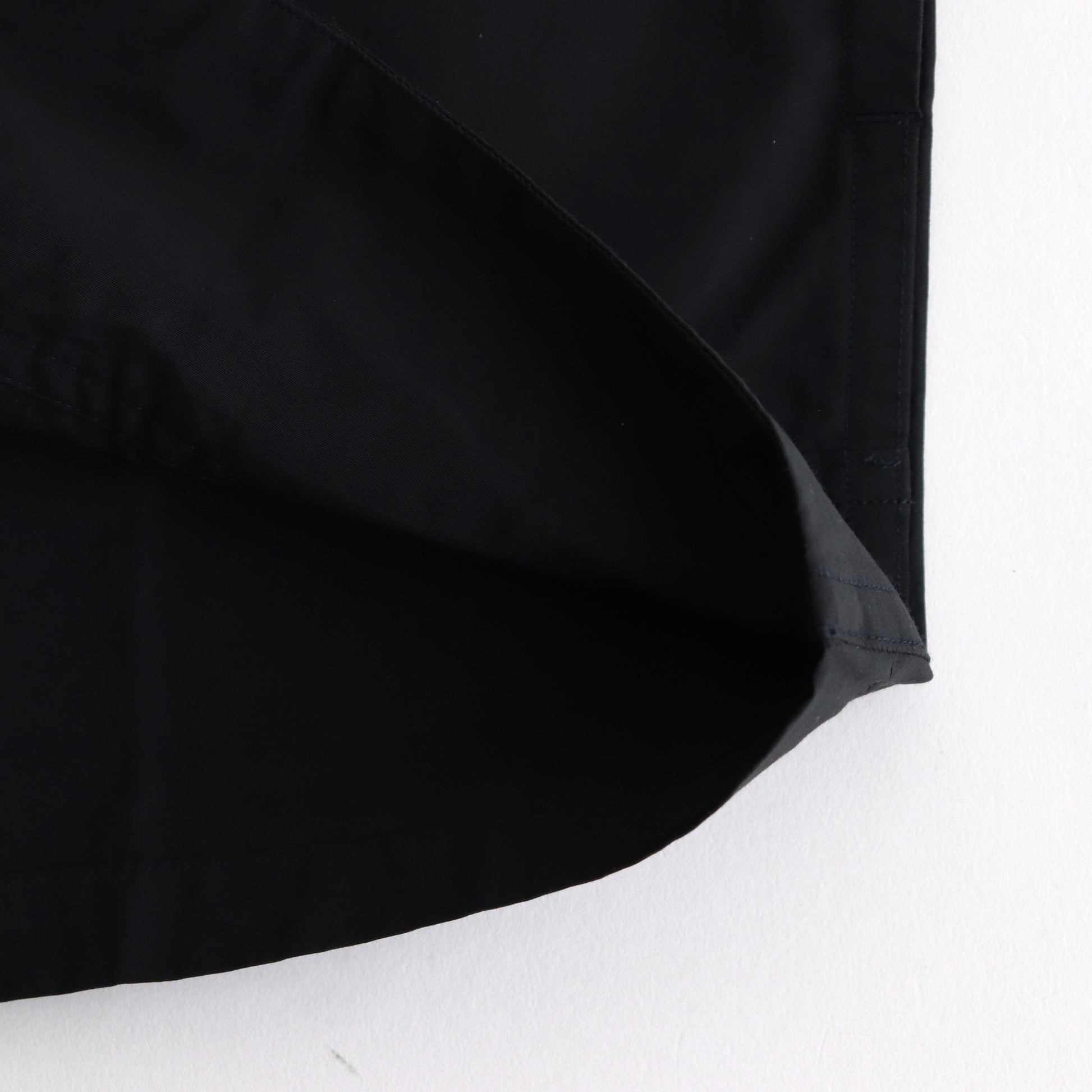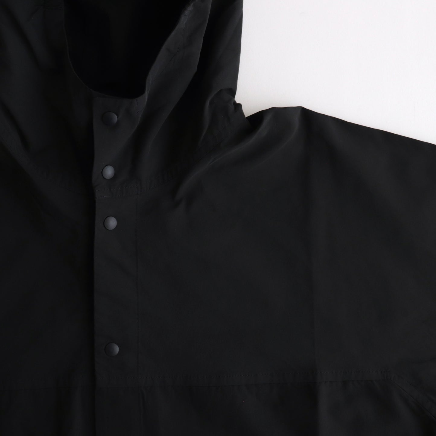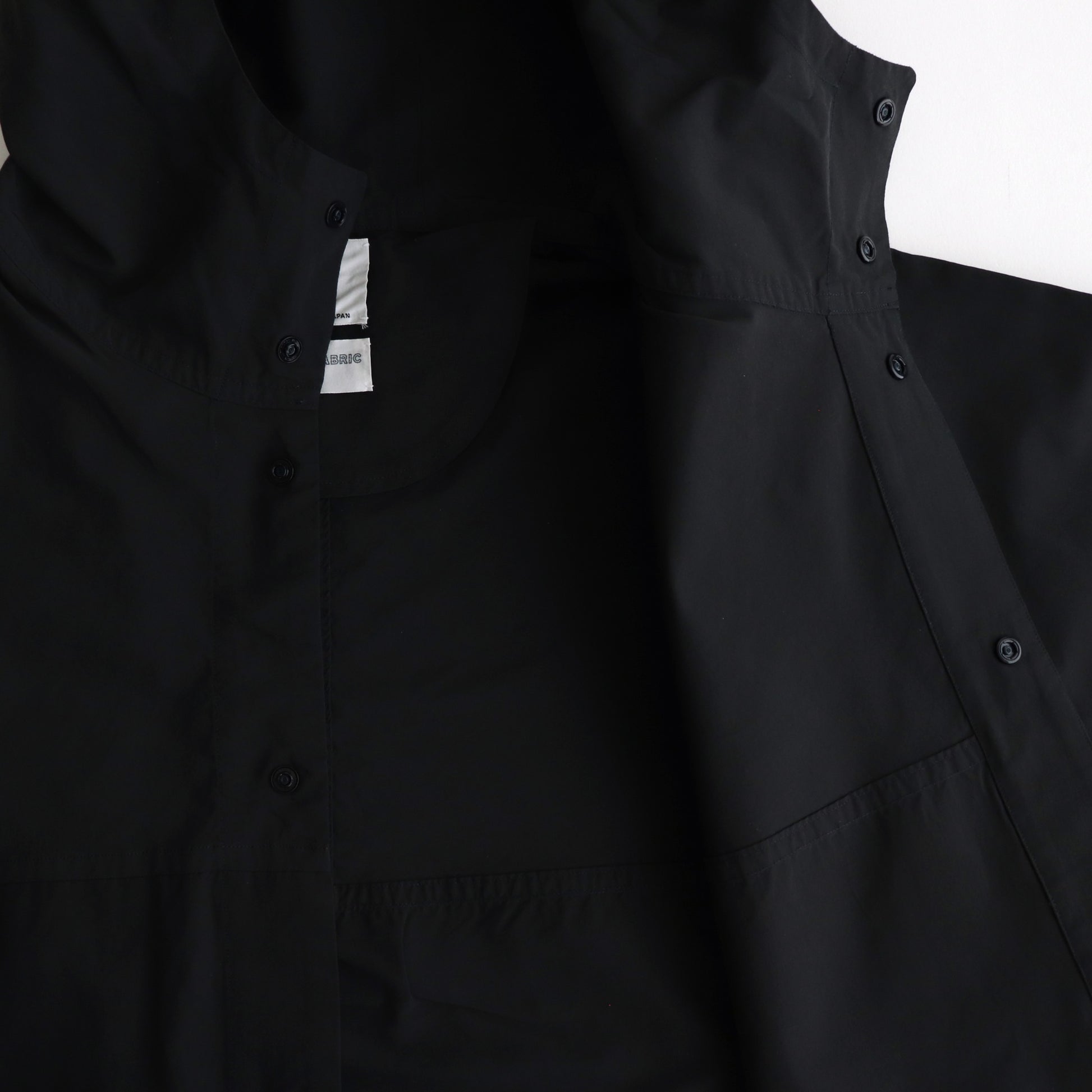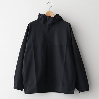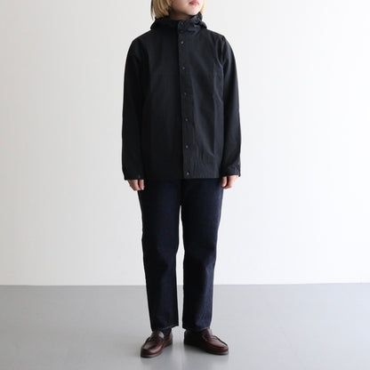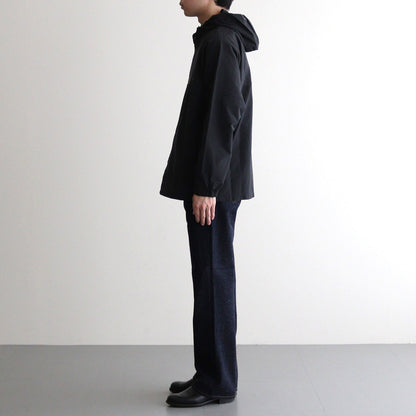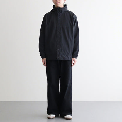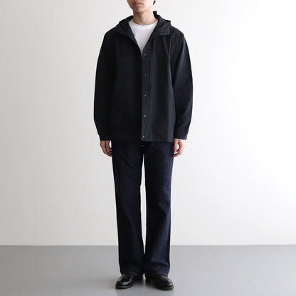 ほどよくゆとりを持たせたリラックスシルエットのフード付きシャツ。胸部と袖のパネルを分けない独特のパターンを採用することでアームの可動域を確保したデザイン。脇下にパンチングを入れた生地を採用しベンチレーション機能を付与。前立てはスナップボタン仕様で用意に開閉が可能。脇線に沿うようにボタンで開閉できるシームポケット付き。