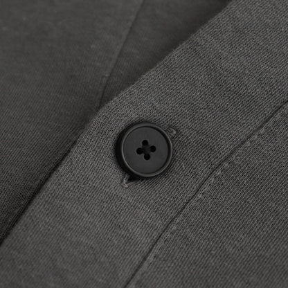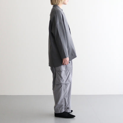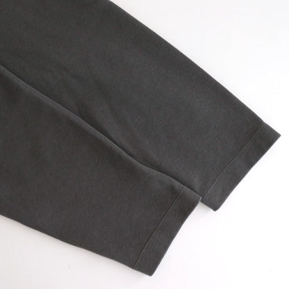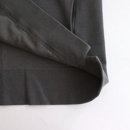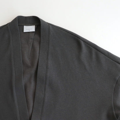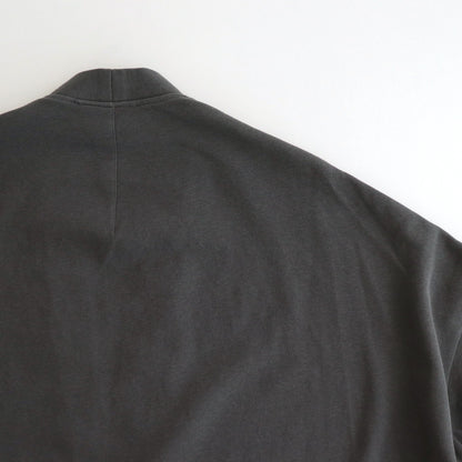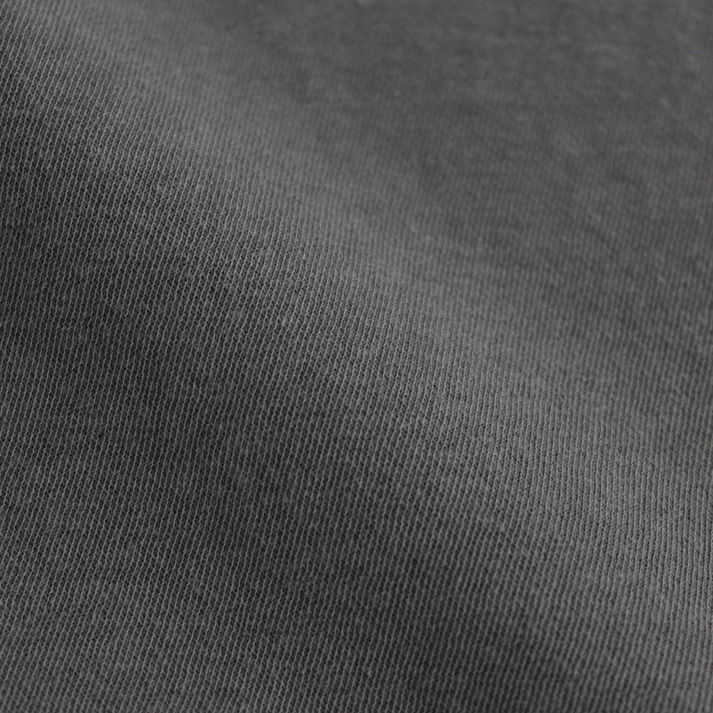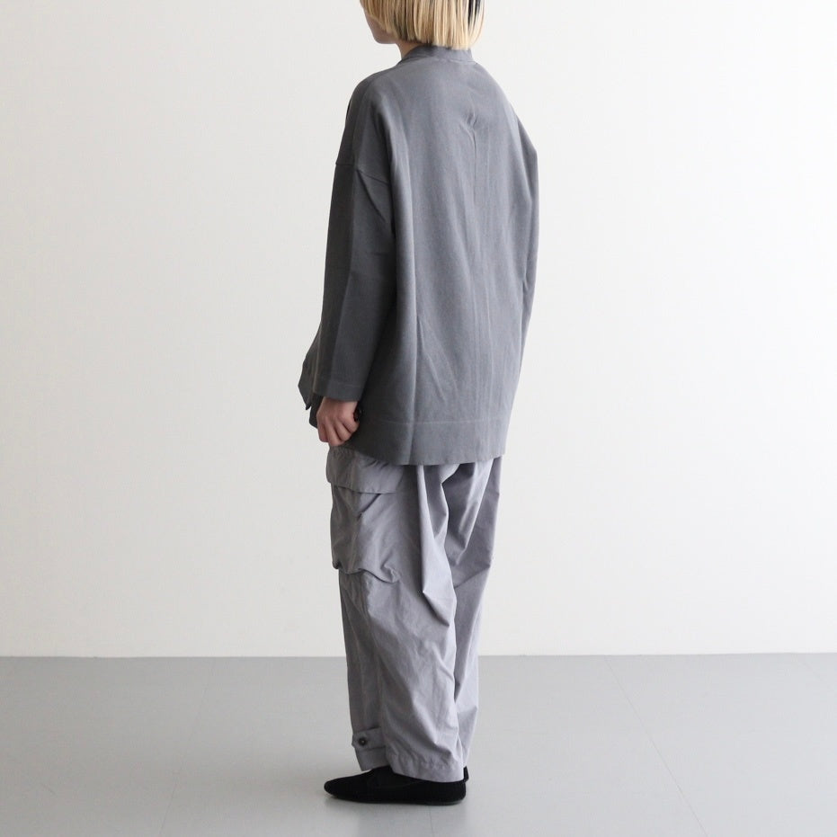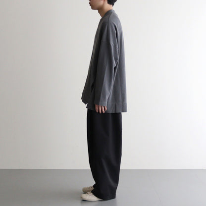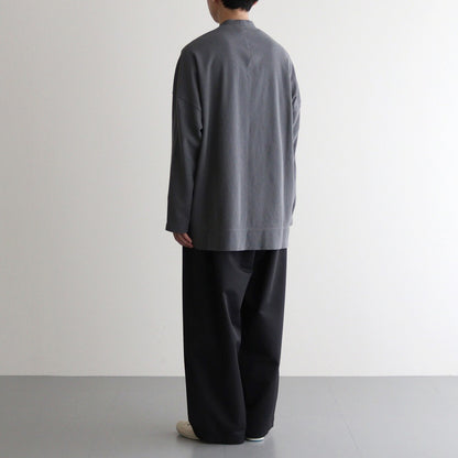 表面にボリュームのある強撚コットン糸を使用し、中糸に50Dのナイロン糸、裏面に通常の撚りのコットン糸を使用した二重編みの素材です。強撚糸を外に出すことでドライタッチで粗野な雰囲気に仕上げ、裏面はレギュラー糸を使用することで柔らかいタッチに仕上げています。軽さやさらっとした質感ながら厚みがあるので透けを気にせず夏場まで着用いただけます。