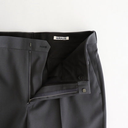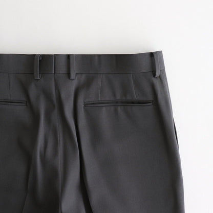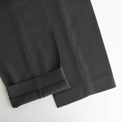 腿回りにほどよいゆとりを持たせ、裾に掛けてストンと落ちるラインが美しいストレートシルエットのスラックス。フロントはYKKファスナーを採用したジッパーフライ仕様。腰裏に別生地を張る事で着用時のフィット感を高め、シャツインした時のズレを抑える役割を果たしています。腰の位置に実用性に優れたフォワードセットポケット、バックにボタン留めの両玉縁ポケットを配置。腿裏にのみ裏地を貼ることで着用時の足通り、動き易さと共に耐久性を向上させています。