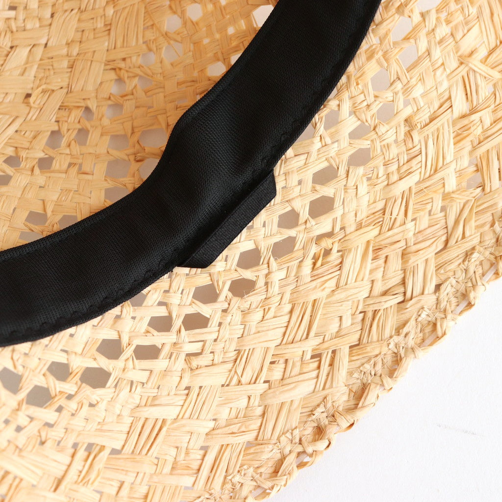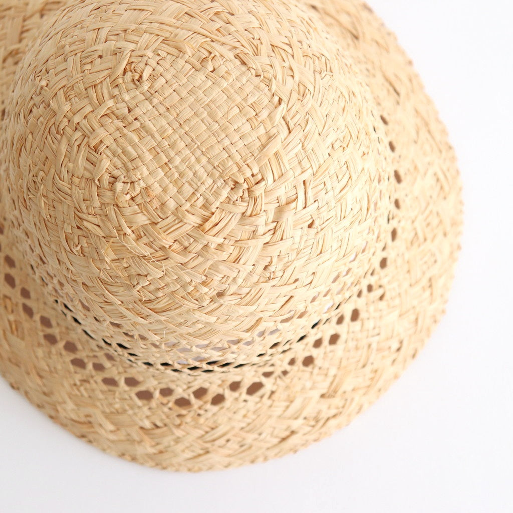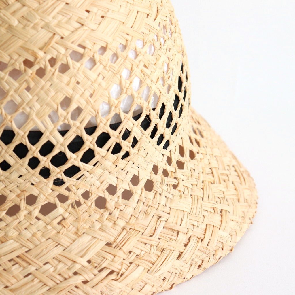 形はチューリップタイプのコンパクトなシルエット。今では作れなくなってしまっていたデッドストックのマテリアルを元に、現代に残っている技術で可能な限り再現したオリジナルのマテリアル。素材はナチュラルカラーが美しいラフィアを使用。内側のテープでサイズ調節が可能です。