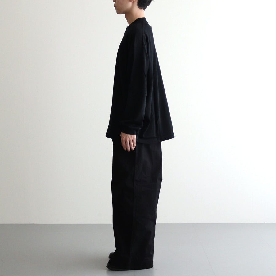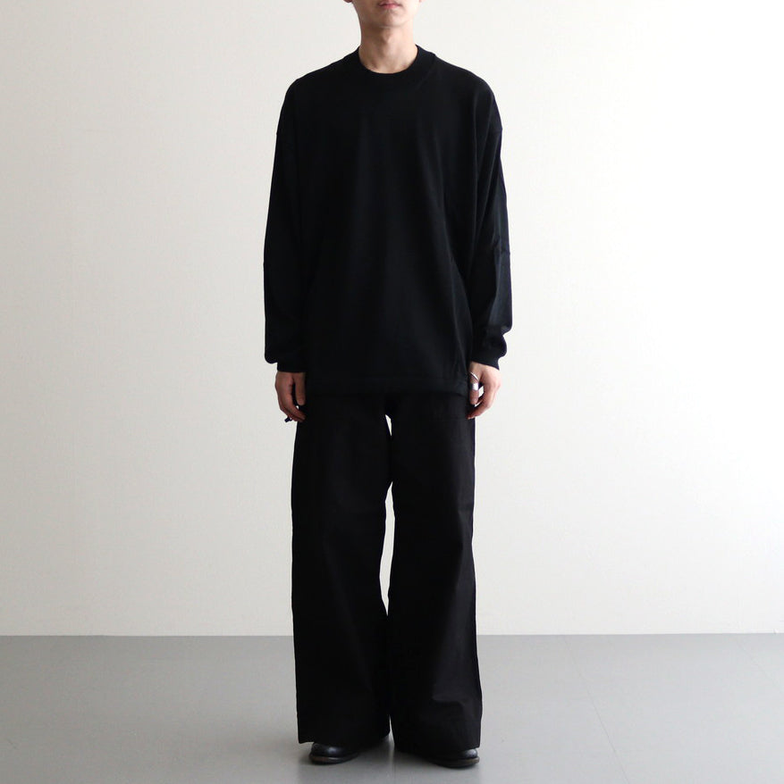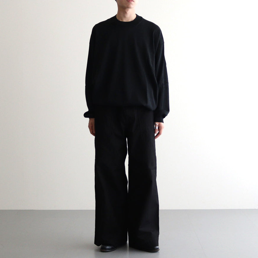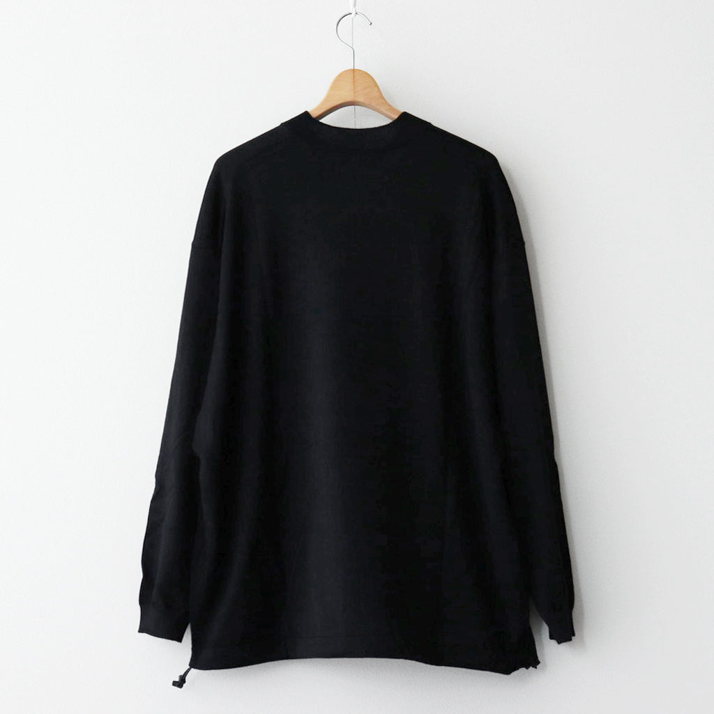 ゆったりとしたリラックスシルエットの丸首セーターです。首周りと袖先を締め付けの強くないリブに切り替えることで生地を補強。裾にはゴムコードを通し、好みに合わせてシルエットに変化をつけることが可能な仕様に。左裾にはブランドロゴの刺繍入り。