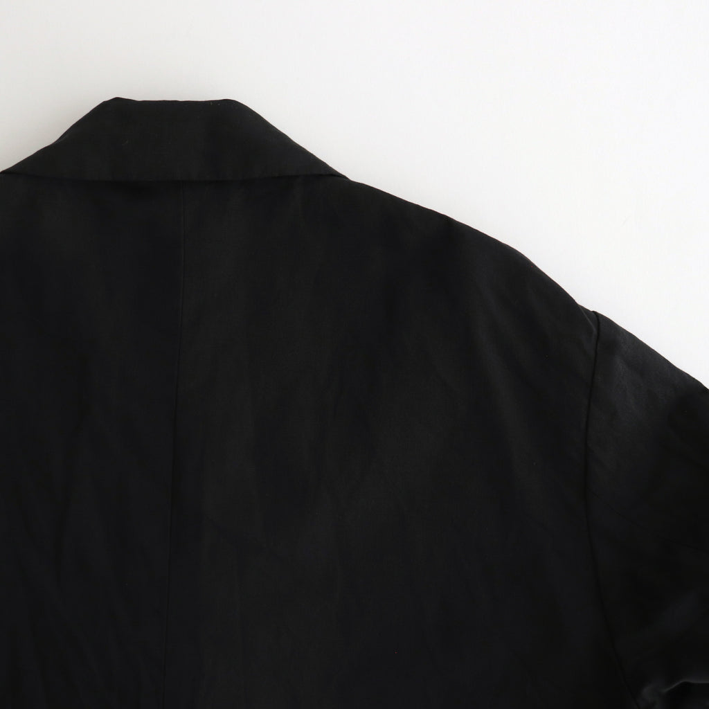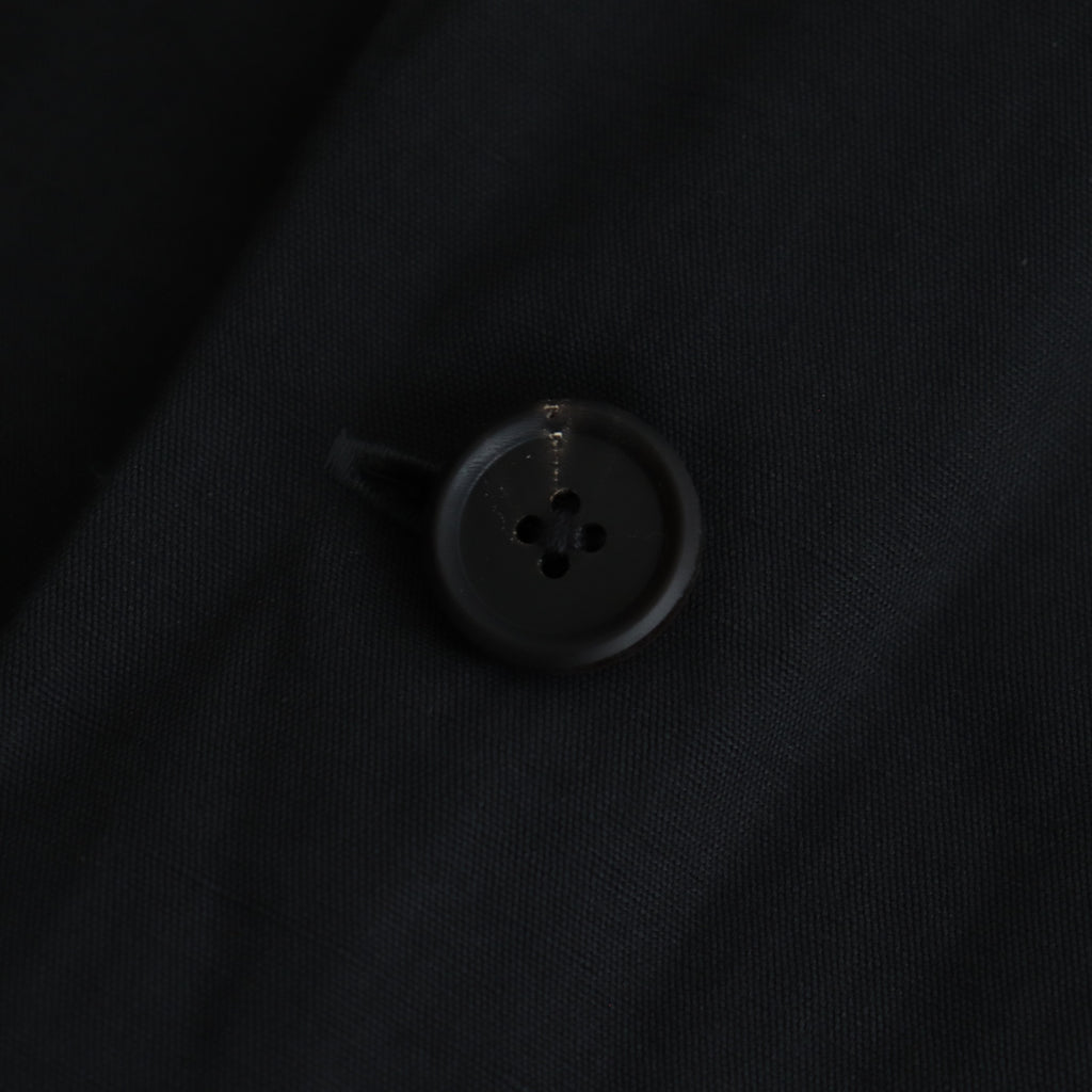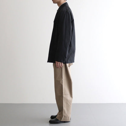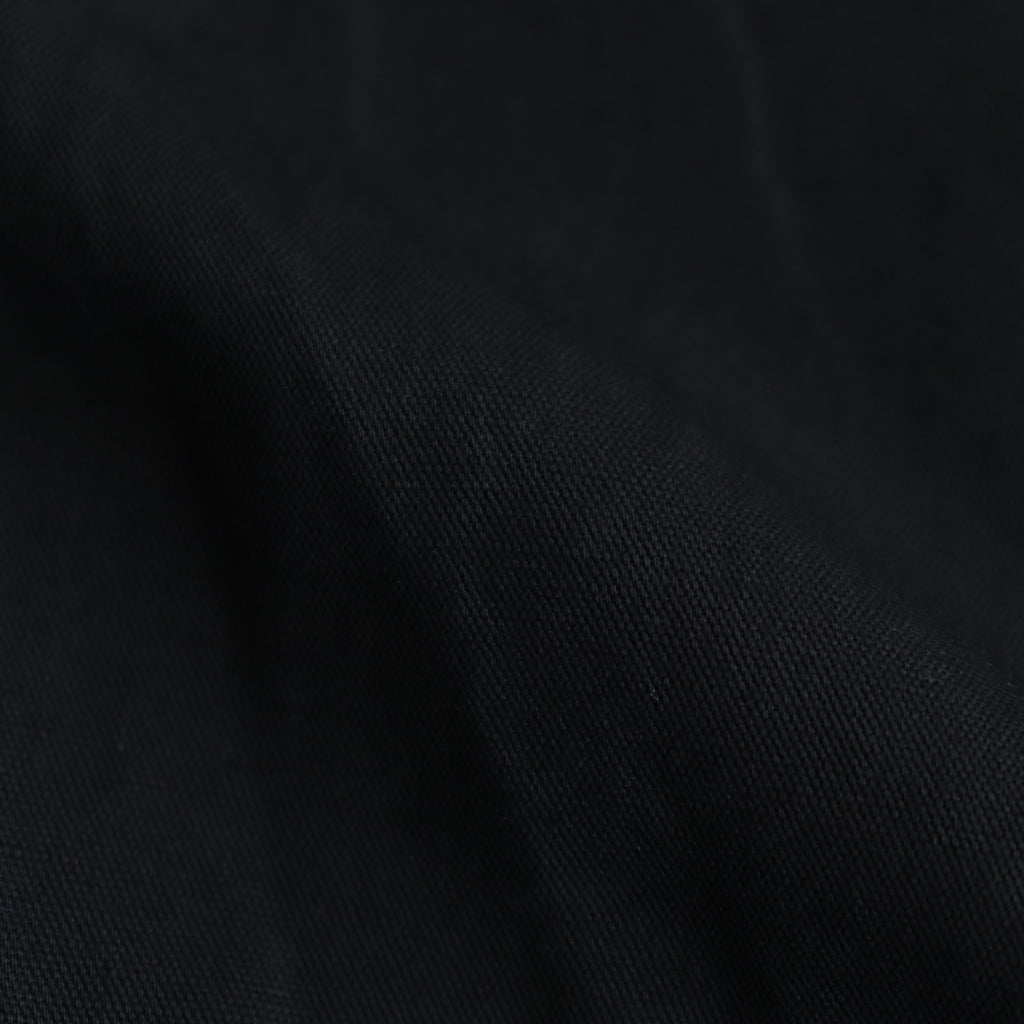 番手の小さい糸を高密度に織り上げたコットン×リネンのブレンド生地を使用。ヤエカらしい優しい雰囲気は残しつつも、全体をマットに仕上げることで落ち着いた雰囲気に仕上げた素材です。草木染めにより深い黒色に染めており、着用を重ねることで色落ちも楽しめる生す。
