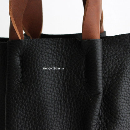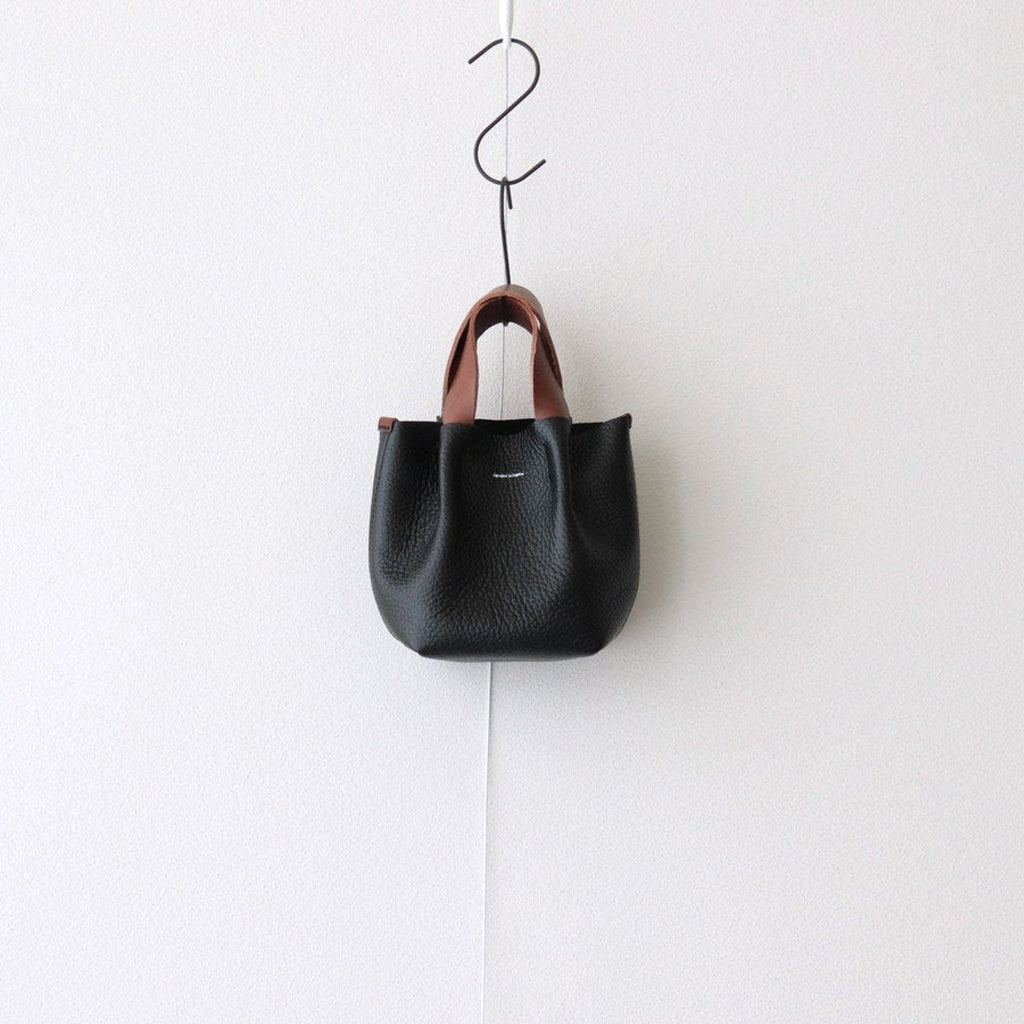 バッグ本体の革には胴のカウシボレザー、手縫いで縫い付けたハンドルにはオイルを多く含んだベジタブルタンニン鞣しのヌメ革を使用しています。胴のレザーはかさ張らないように床処理をして一枚仕立てに。ハンドル部分は手の馴染みがとても良く、使い込むことで更に風合いが増していき、雰囲気が良くなっていきます。ハンドルを縫い付けている部分に丸みを持たせることでプロダクトに奥行きと表情を持たせています。シンプルな構造なのでとても使い心地が良いです。Hender Schemeの箔押し入り。可愛らしい見た目で、ちょっとしたお出掛けにピッタリのサイズです。