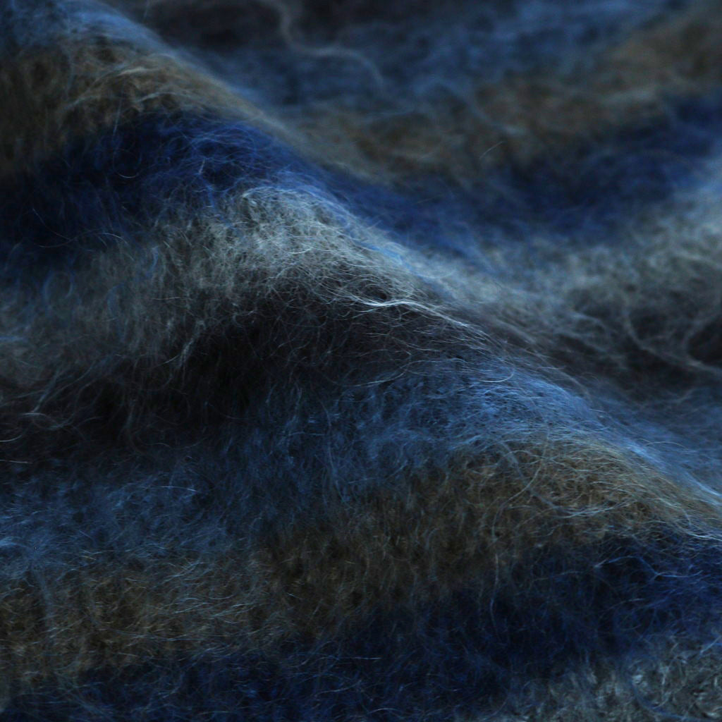 キッドモヘアのタムタムヤーンと呼ばれる毛足を持たせた糸を使用したニット素材。モヘアはウールに比べスケールが小さく、滑らかでやわらかい質感と光沢があるのが特徴です。ナイロンをブレンドすることで適度なコシとボリューム感を持たせているため空気を多く含み暖かい着用感をお楽しみいただけます。