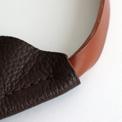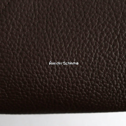 手縫いで縫い付けたハンドルにはオイルを多く含んだベジタブルタンニン鞣しのヌメ革を使用しています。胴のレザーはかさ張らないように床処理をして一枚仕立てに。ハンドル部分は手の馴染みがとても良く、使い込むことで更に風合いが増していき、雰囲気が良くなっていきます。ハンドルを縫い付けている部分に丸みを持たせることでプロダクトに奥行きと表情を持たせています。Hender Schemeの箔押し入り。