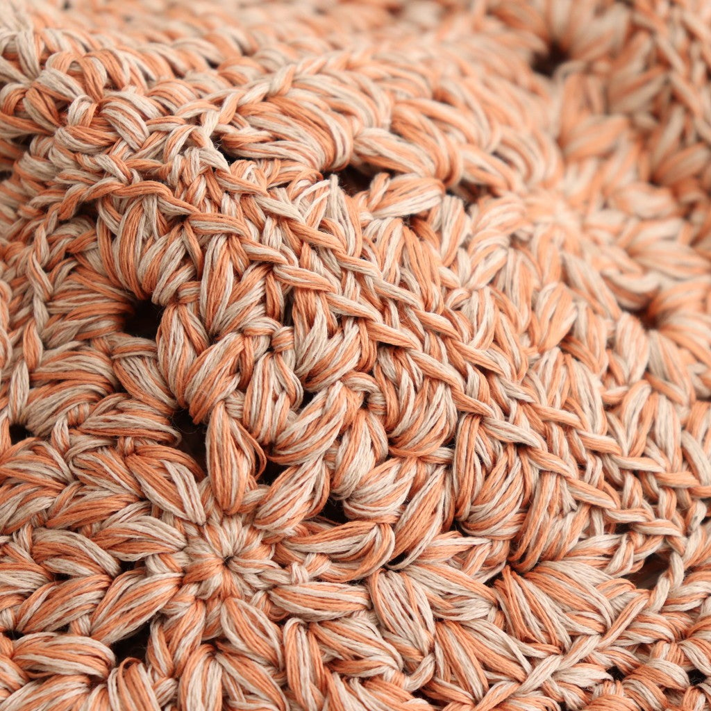手編みのコットンニットを使用したクロシェハット。素材に特殊な加工を施し、麻のようなシャリ感とハリ・コシを持たせています。少し短めで緩やかな傾斜のツバがセーラー帽のようなすっきりとした印象に。素材がしなやかなので折り畳みが可能で持ち運びも便利です。