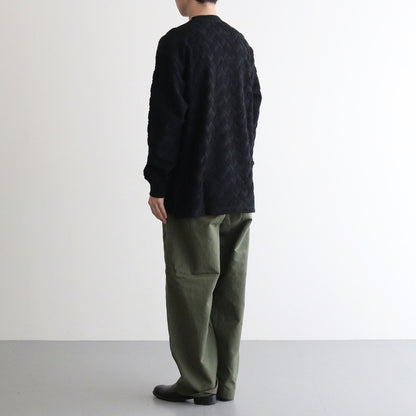 上質なコットン素材を使用したパイル織りの素材を使用。パイルの長さを変えることで特徴的な柄を表現した生地です。程よく厚みはありますがパイル組織のため肌との接地面は多くなく、着用できる季節の長い風合いの素材です。