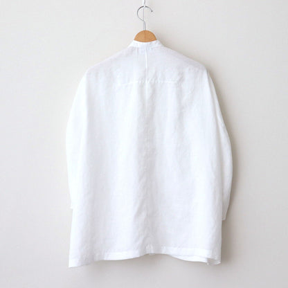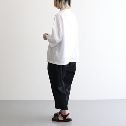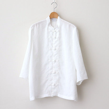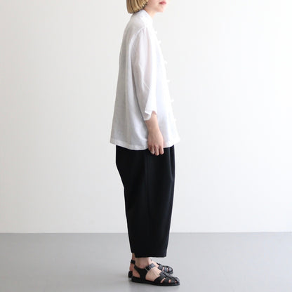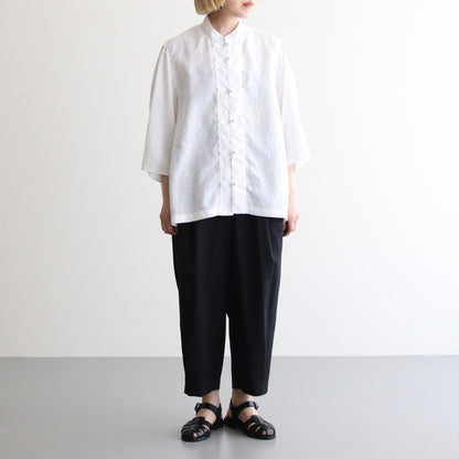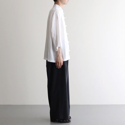 ゆったりとしたワイドシルエットで製作されたチャイナシャツ。身幅にゆとりを持たせ、着丈をコンパクトにすることで全体のバランスをとったシルエット。袖を二枚袖にすることで立体的なカーブを描く綺麗なシルエットに。