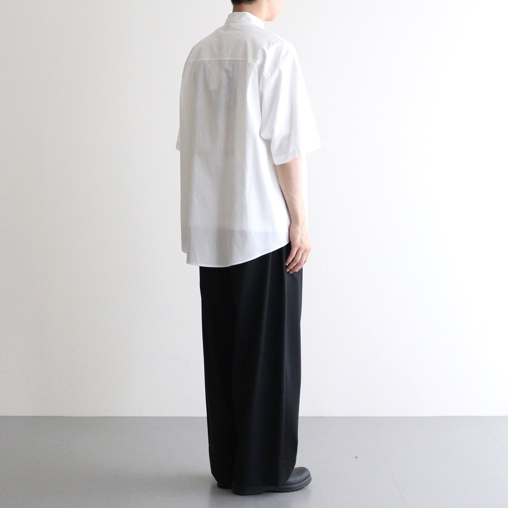 ゆったりとしたリラックスシルエットの半袖シャツ。衿はレギュラーカラー仕様。バックヨークの左右にタックを入れることで肩周りの可動域を広げ、快適な着心地を実現。前立ての釦には高級感のあるシェルボタンを採用しています。