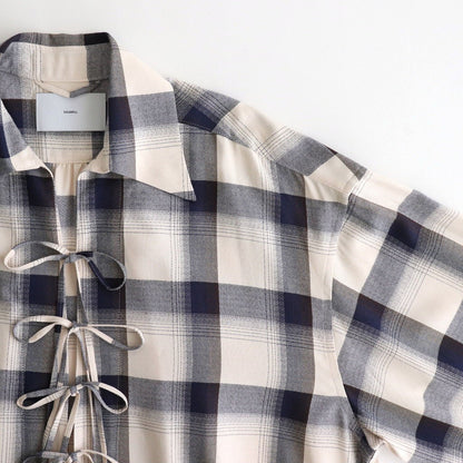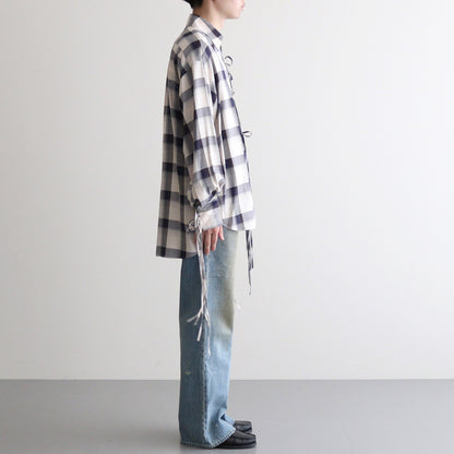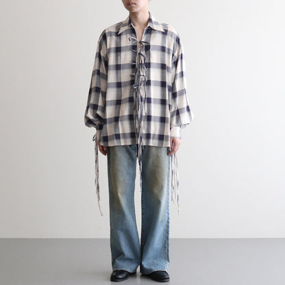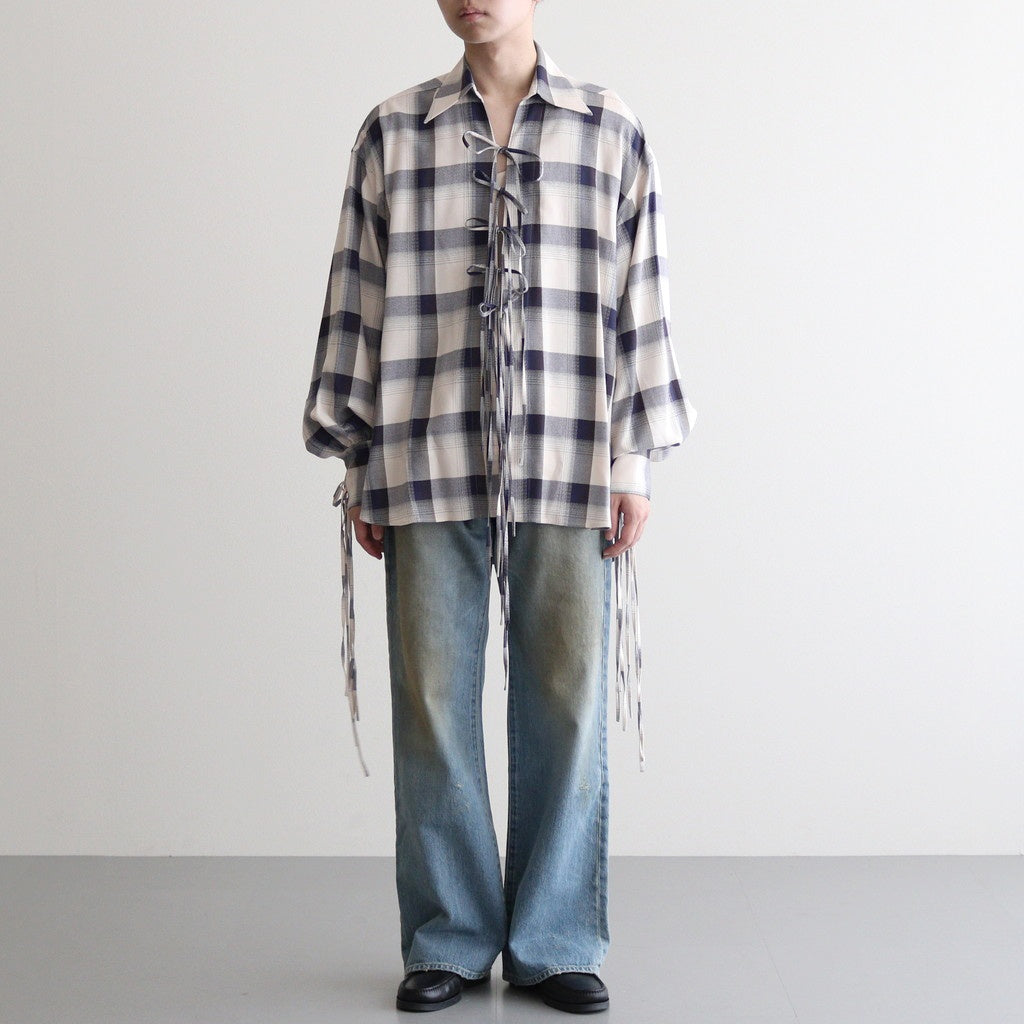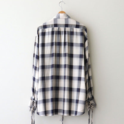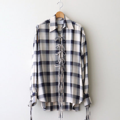 全体にゆとりを持たせたリラックスシルエットの長袖シャツ。フロントやカフスを長めのコードで調整できるようにしたドレスライクな雰囲気の一着。垂らしてラフな雰囲気で着用したり、綺麗に結んできっちりとした印象で着用したりと様々なスタイルを演出できる一着です。