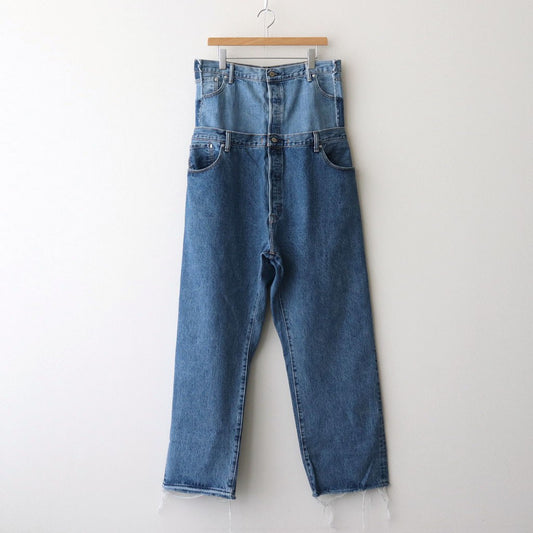 ユーズドデニムを解体し、つなぎ合わせることで再整形したデニムパンツ。ウエストを2重にしたデザインが特徴的。上部をコルセットのように高い位置で留めたり、折り返して腰穿きしたり、ベルトで留めたりと、様々な着こなしがお楽しみいただけます。