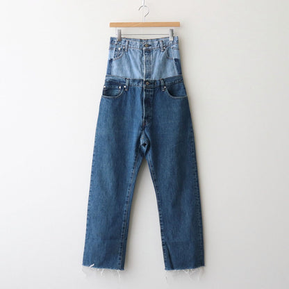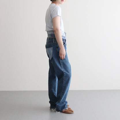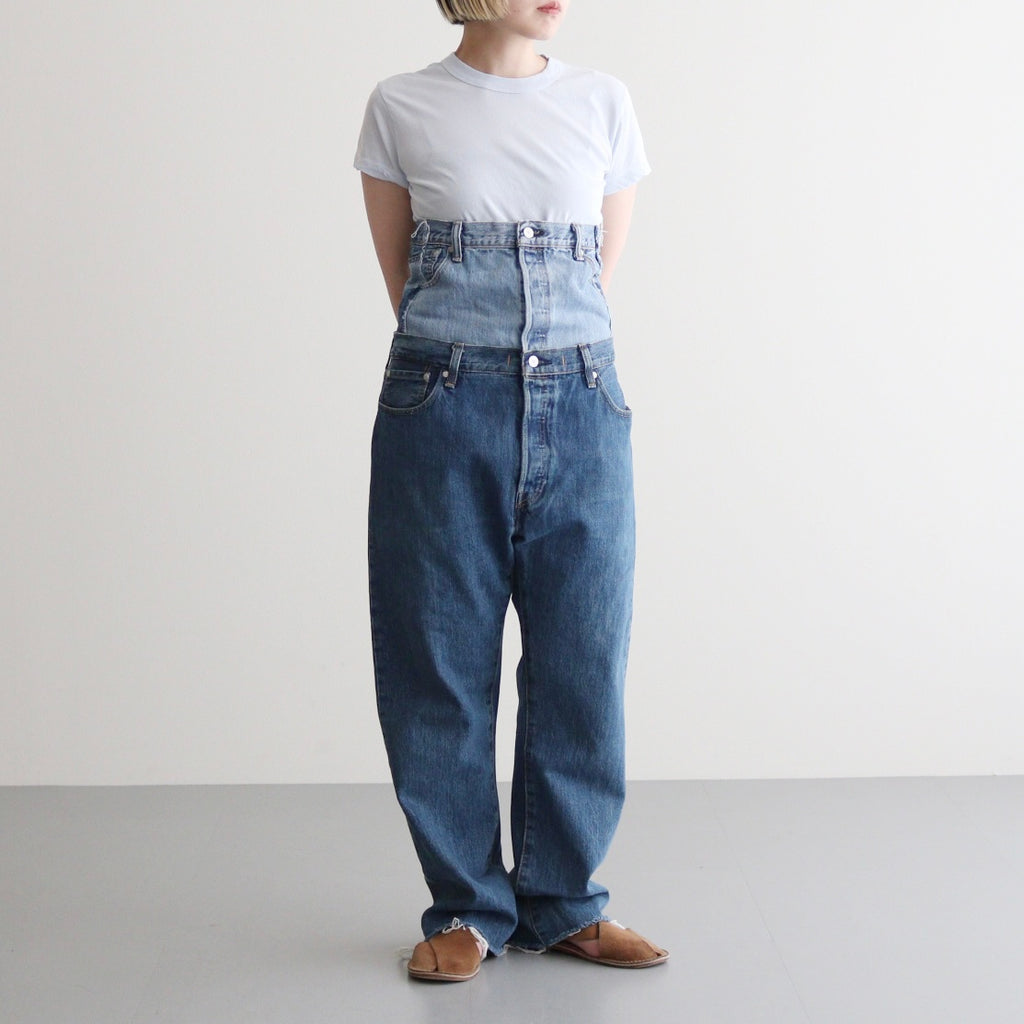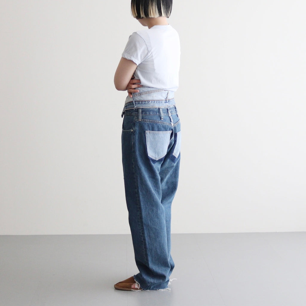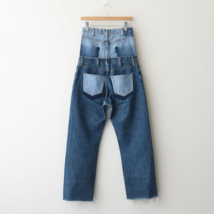 ユーズドデニムを解体し、つなぎ合わせることで再整形したデニムパンツ。ウエストを2重にしたデザインが特徴的。上部をコルセットのように高い位置で留めたり、折り返して腰穿きしたり、ベルトで留めたりと、様々な着こなしがお楽しみいただけます。