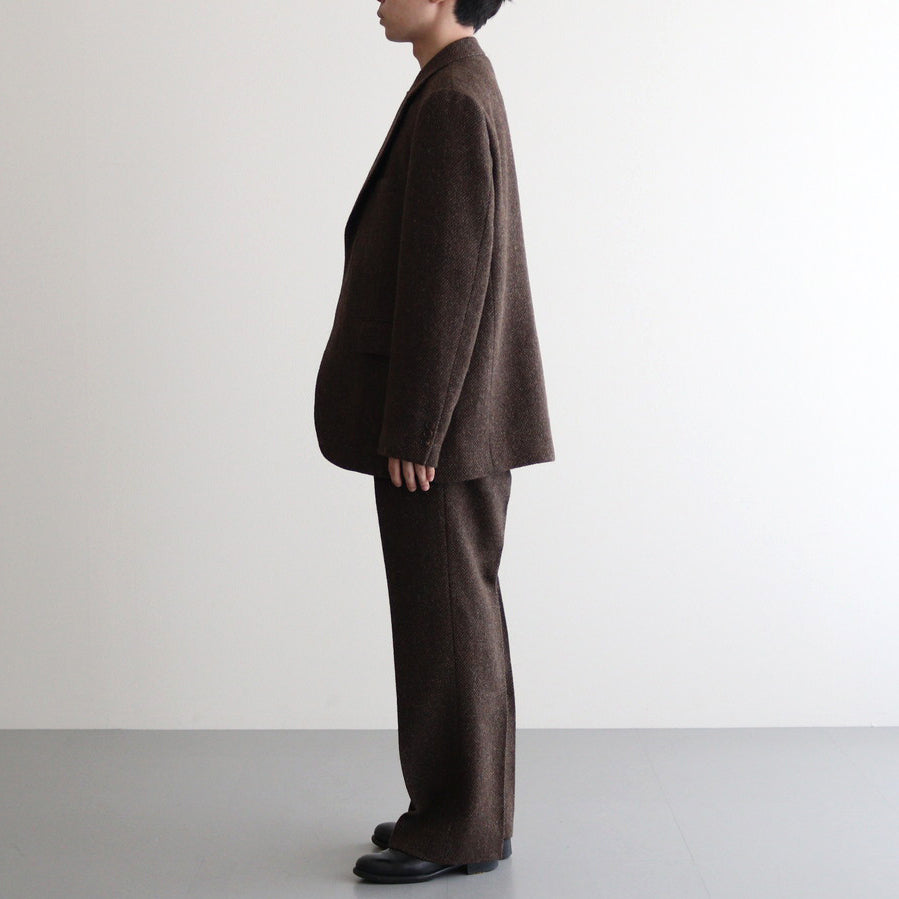 ほどよくゆとりを持たせたリラックスフィットのシングルブレストジャケット。襟は自然な大きさのノッチドラペルとなっており、フロントボタンを隠したミニマルな雰囲気に。左胸にポケットが一つ、両サイドにフラップ付きのポケット、また内ポケットも両側に設計されています。背面にセンターベントを入れることで可動域を広げるとともにスタイリッシュな雰囲気に仕上げています。
