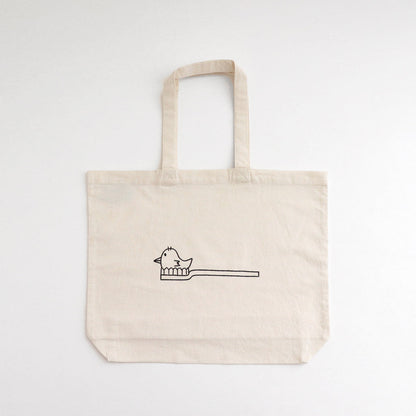 現代アーティストである加賀美 健さんのイラスト「TORI」をプリントしたトートバッグ。ユニークなタッチでハブラシの上にトリがたたずむ作品が描かれています。バッグ本体はライトなコットン生地を用いた横長の仕様。ほどよくマチがあるので見た目以上に容量も豊富。シンプルな構造なので使い勝手も抜群です。男性女性問わず使えるクリーンなデザインです。