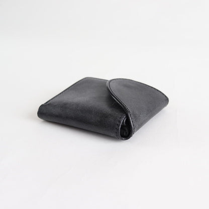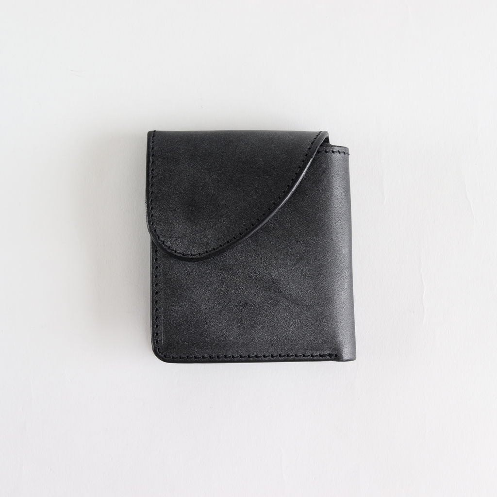 デザインはフラップの付いたシンプルな2つ折り型。シンプル故の使い易さをお楽しみいただけます。手にすっぽりと収まる持ちやすく使いやすい大きさが特徴です。スナップボタンで開閉する仕様。容量は札入れが1箇所、小銭入れが1箇所、カード入れが2箇所となります。カード収納部分にある程度ゆとりを持たせているのでカードを重ねて入れることが可能です。Hender Schemeの箔押し入り。