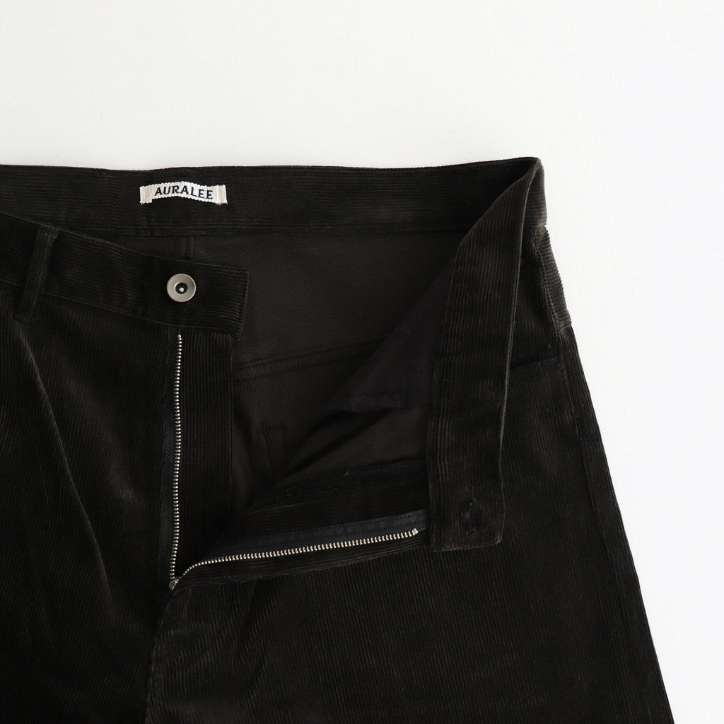 全体にボリュームを持たせたワイドフィットのテーパードシルエットで製作。腿回りに大きくゆとりを持たせ、裾に向けてゆるやかにテーパードをかけたシルエット。丈が長めで裾幅も広めのためストレートのようにも見える一本です。前立てはジップフライ仕様。