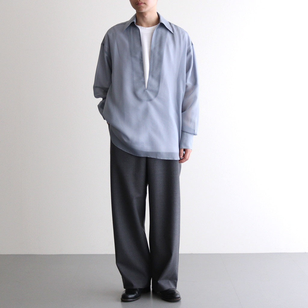 身幅にゆとりを持たせたリラックスシルエットのスキッパーシャツ。襟付きで深めのVネックが特徴的なスキッパー仕様。袖口はシングルカフス。袖先にタックを入れることで丸みを持たせ納まりの良いシルエットに。バックヨークの左右にタックを入れ、肩周りにゆとりを持たせることで動き易さを考慮した作り。