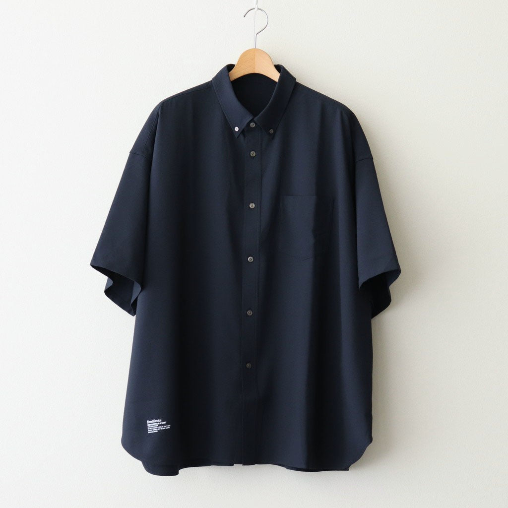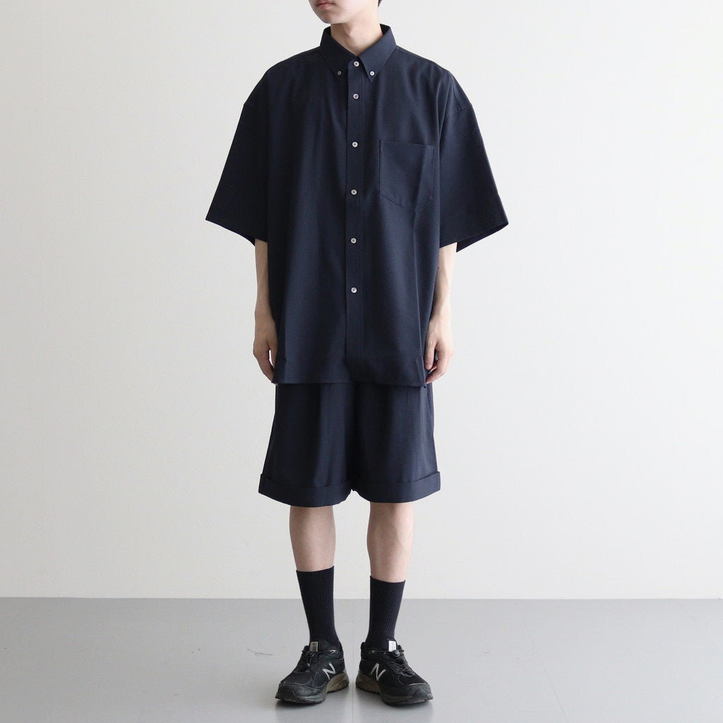 リラックス感のあるビッグシルエットで製作された半袖ボタンダウンシャツ。標準的な大きさの剣先にボタンを取り付け、カジュアルな雰囲気に仕立てたボタンダウン仕様の一着。袖は長め。裾先にブランドネームのプリント入り。