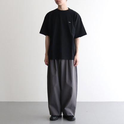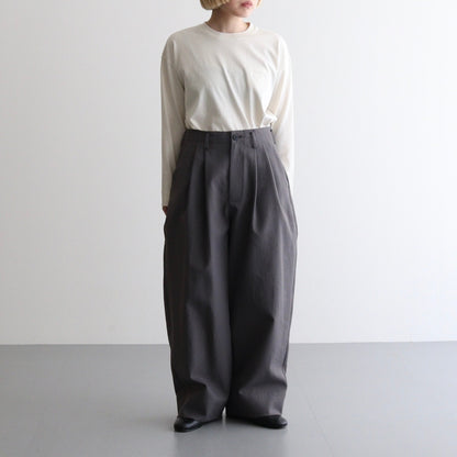 ウエストにタックを2つとったボリューム感のあるワイドシルエットのトラウザー。裾にかけて僅かにテーパードをかけたワイドストレートシルエットで製作されています。両サイドにスラッシュポケット、バックはフラップ付きポケットを配置。フロントはジップフライです。