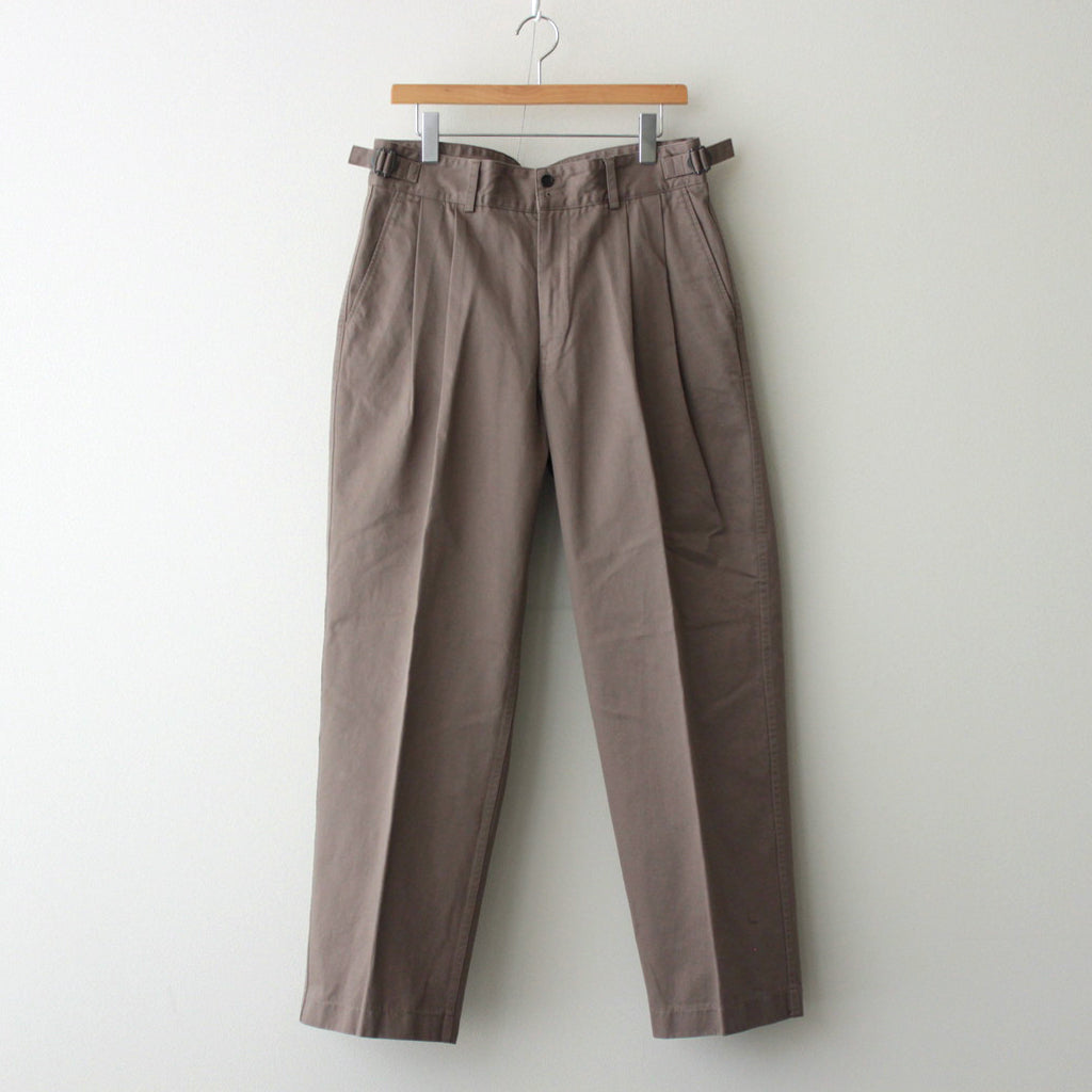 全体にボリュームを持たせ、裾までストンと落ちるワイドストレートシルエットで製作。ウエストにタックをを2つ入れ、包み込むような立体的なシルエットに仕上げています。またウエストは両側のアジャスターでサイズ調節が可能。履きやすさとシルエットの美しさを両立した1本です。