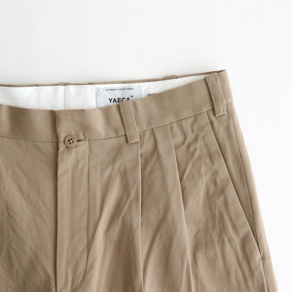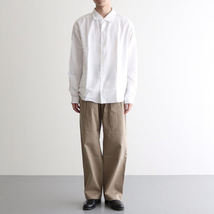ウエストにタックを2つ設計したクラシックな印象のチノパンツ。ボリュームのある腿回りから裾に向けてわずかにテーパードさせたワイドなシルエット。両サイドにスラッシュポケット、脇線に沿って配した実用性に優れたバーティカルスリットポケット、バックはボタン留めの片玉縁ポケットを設計。フロントはジッパーフライ。