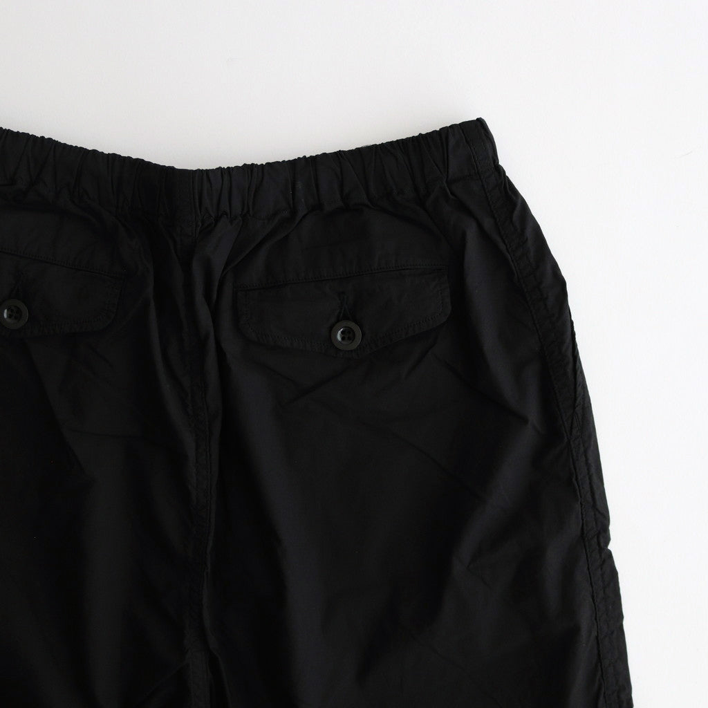 全体にボリュームを持たせたビッグシルエットのパラシュートパンツ。腿回りから裾まで大きくゆとりを持たせ、ひざ下にダーツをつくることで収まりの良いシルエットに設計されたミリタリー由来のボトムスです。各所を巻き縫いし、製品染めを行うことで敢えてパッカリングを強く出したデザインに。