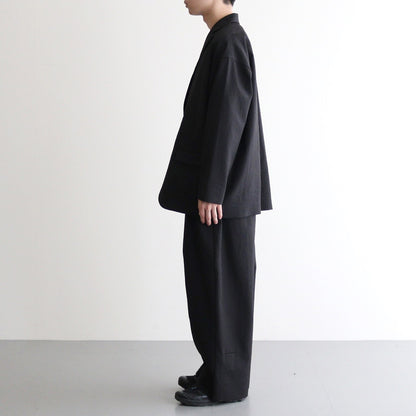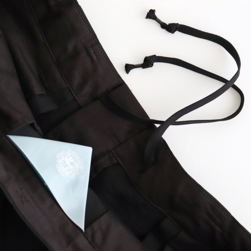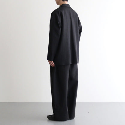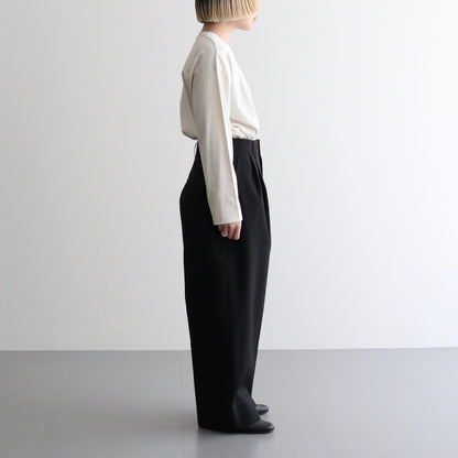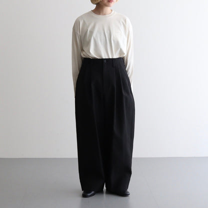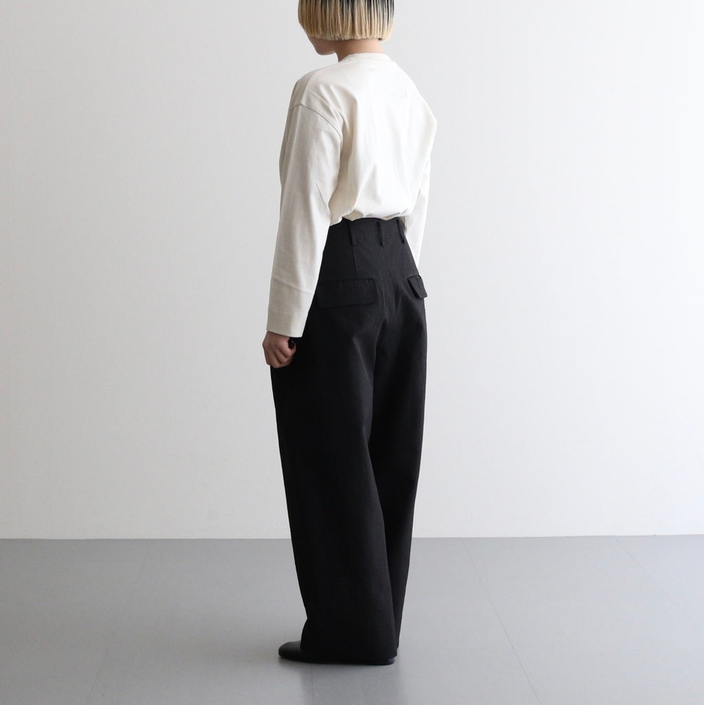ウエストにタックを2つとったボリューム感のあるワイドシルエットのトラウザー。裾にかけて僅かにテーパードをかけたワイドストレートシルエットで製作されています。両サイドにスラッシュポケット、バックはフラップ付きポケットを配置。フロントはジップフライです。