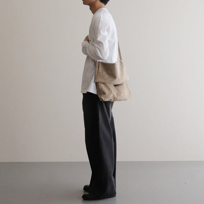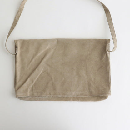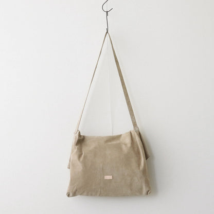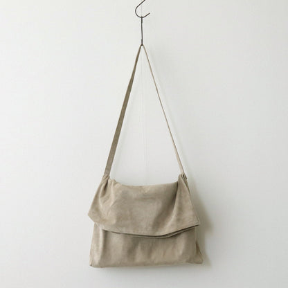 ピッグレザーを使用した柔らかく使い勝手の良いシンプルなショルダーバッグ。大きめの袋形状になっており、上部をパタンと倒すことでフラップにしたシンプルな構造です。容量も大きく素材も柔らかいため体に纏うように着用が可能。素材感も豊かでファッションとも馴染みやすいバッグです。